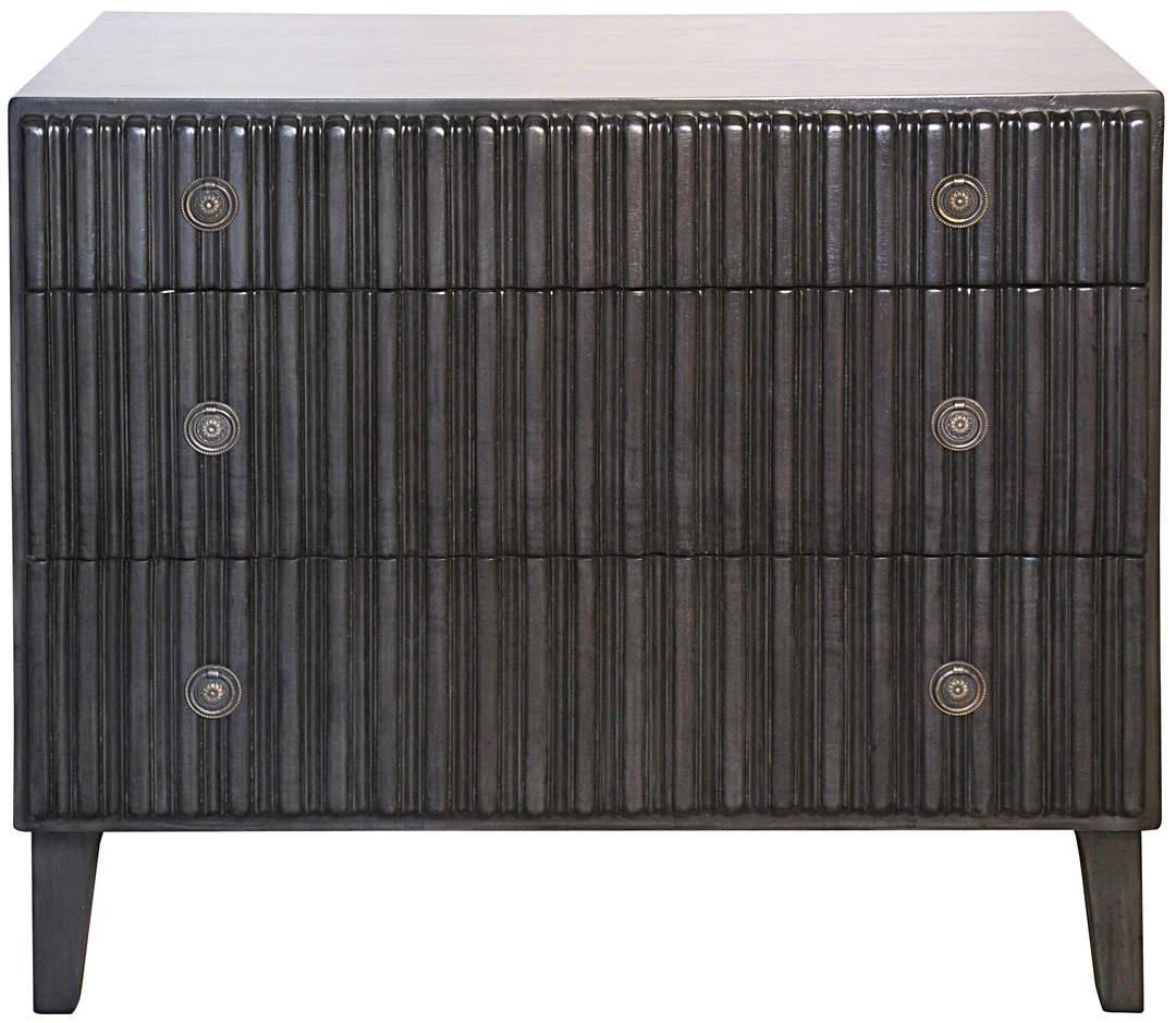 This unique solid mahogany dresser is distinguished by the textural carving on the faces of its three drawers. The unique ribbed carving adds a rustic, slightly industrial appeal. Coordinating metal pulls add interest.