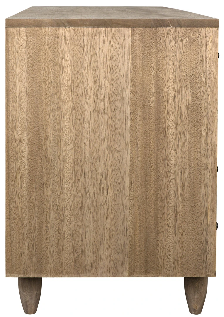 A straightforward walnut chest is elevated with the addition of multiple large diamond-shaped carvings. The elaborate carvings take center stage here, and we keep the rest simple, with metal pulls, peg legs and a rich washed walnut finish.