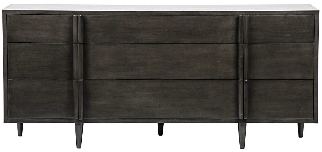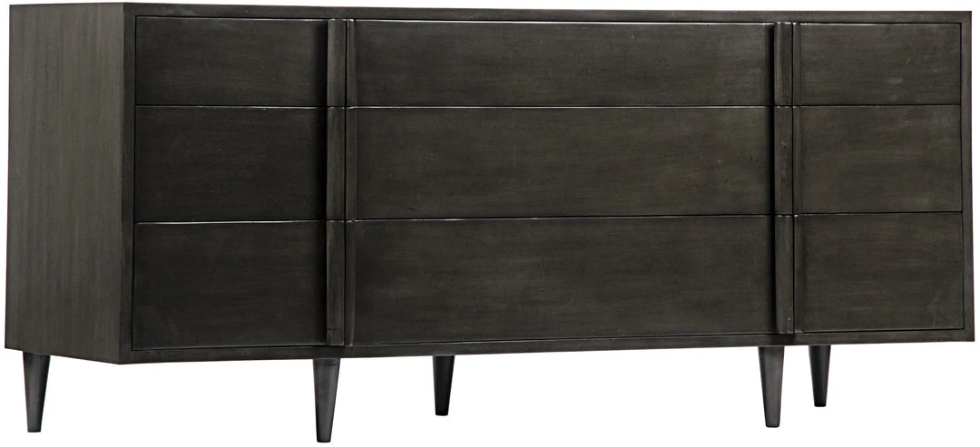 Bold clean lines elevate this hand-carved mahogany dresser, proving that storage can, and should, be stylish” Features include tapered legs and a neutral hand-applied finish, and six medium and three large drawers to provide plenty of room to stash essentials.