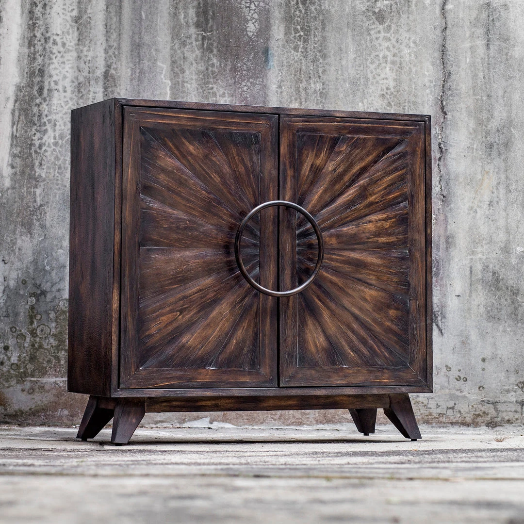 Featuring A Glowing Hand Rubbed Finish Of Worn Black With Honey Undertones And Gray Glazing Over Mango Veneer, This 2 Door Cabinet Is Accented With Curved Sunburst Inlay Doors. Iron Ring Hardware In Dark Bronze Reveals Four Adjustable Shelves.
