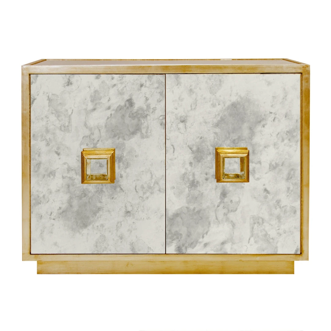 Looking to amp up your style with megawatt glamour? Our Winslow two door cabinet is an extraordinary pairing of one-of-a-kind antique mirror overlaid with hand-applied, gold leaf overlay and border. Greek key base detail and gold square hardware elevate this show piece to five star status. Includes fixed interior shelf.