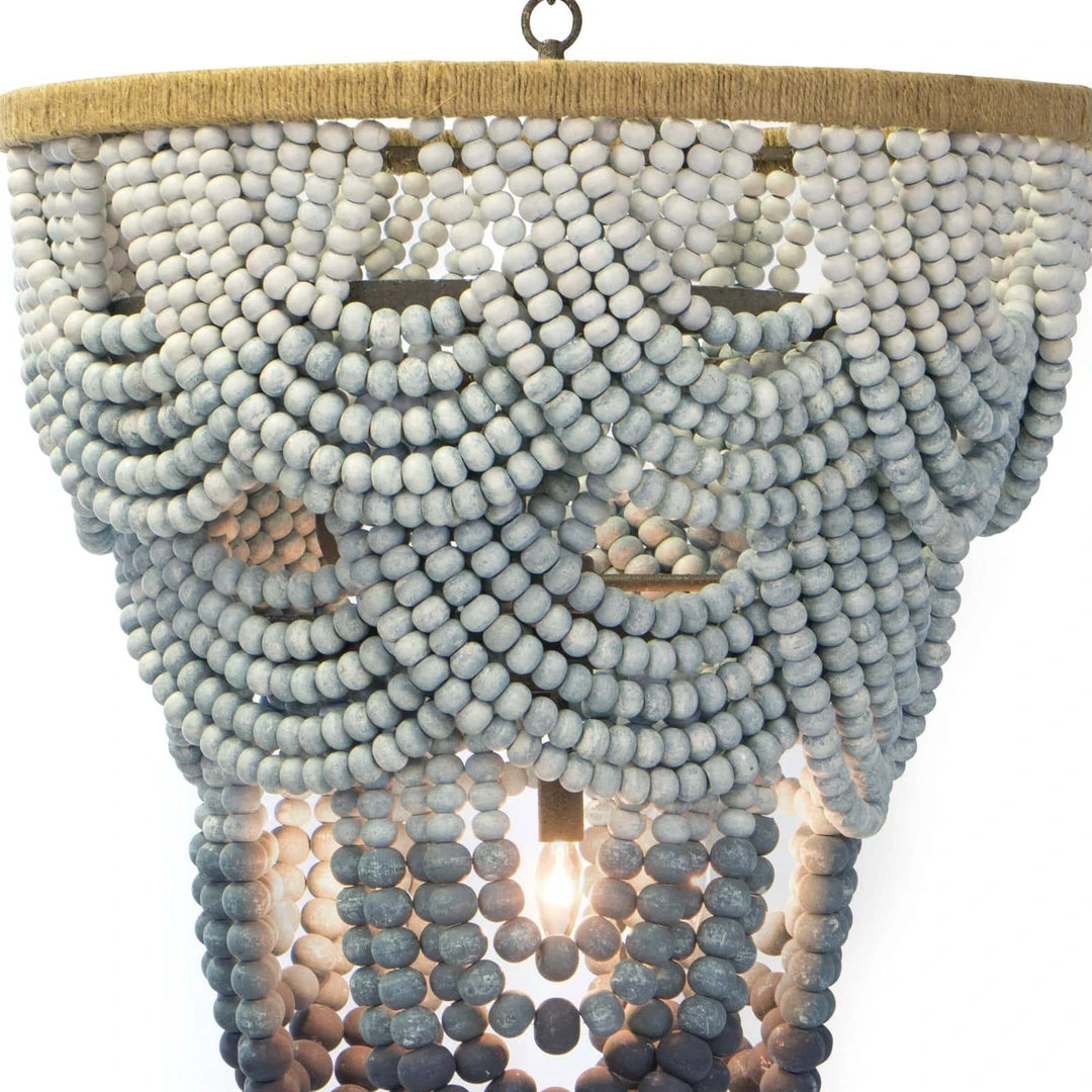 We’ve ombre’d lighting in this latest coastal chic chandelier. Wooden beads in various shades of blue drape gracefully in gradient layers, capped with a rattan-wrapped circular frame. This would look serene in a living room or breakfast nook.
