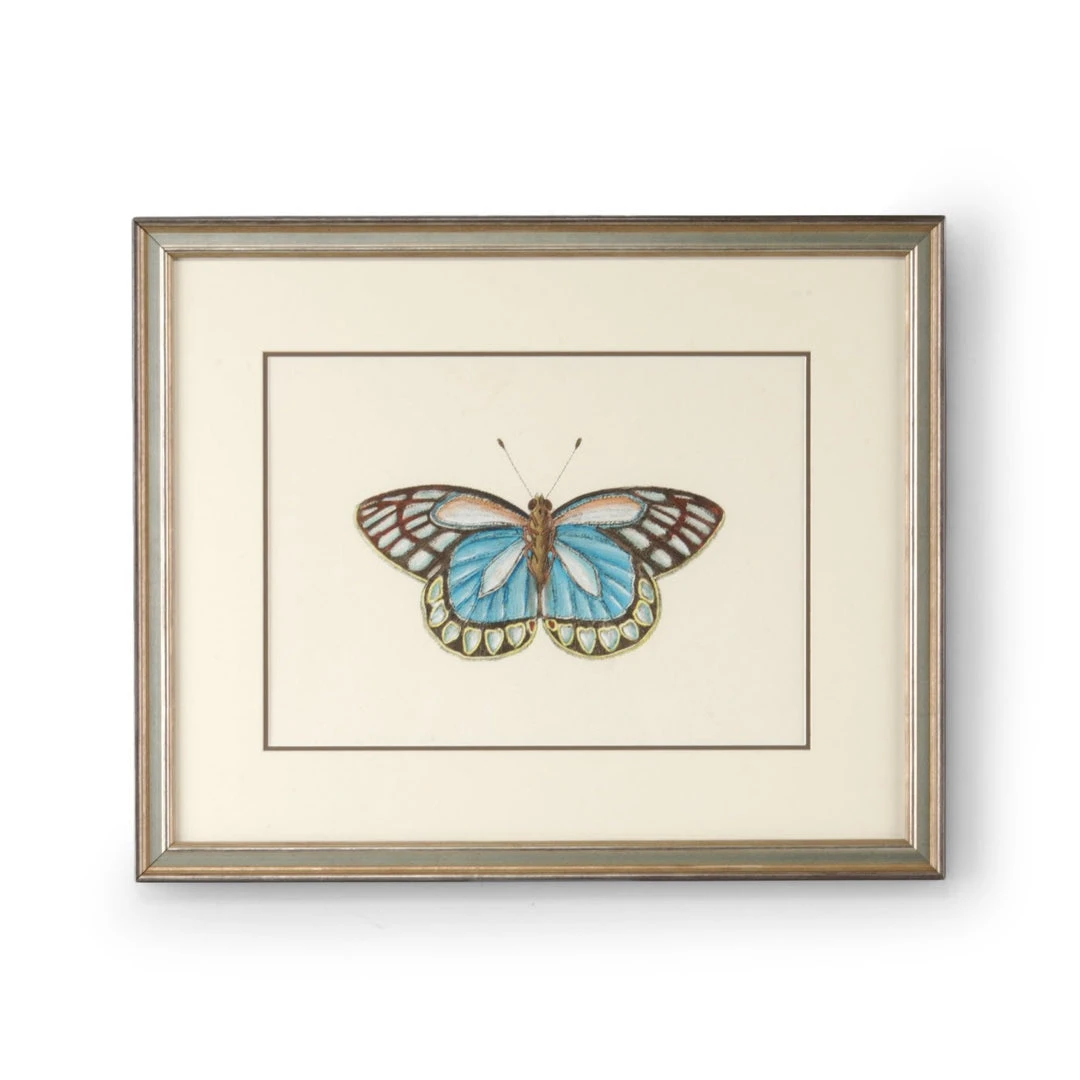 Hand Painted Lithograph,double Mat,antique Silver Frame Art From La Casa/Smp# Butterfly Turquois