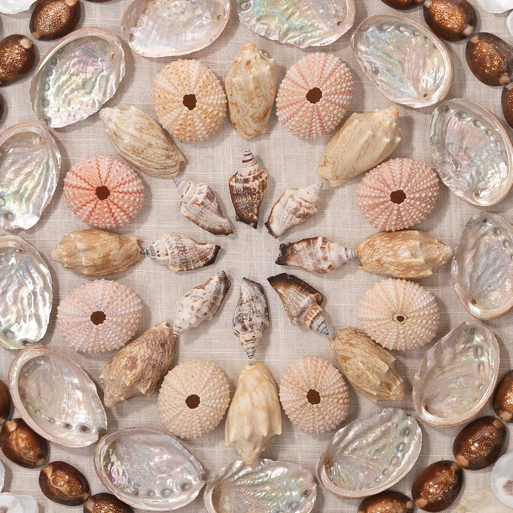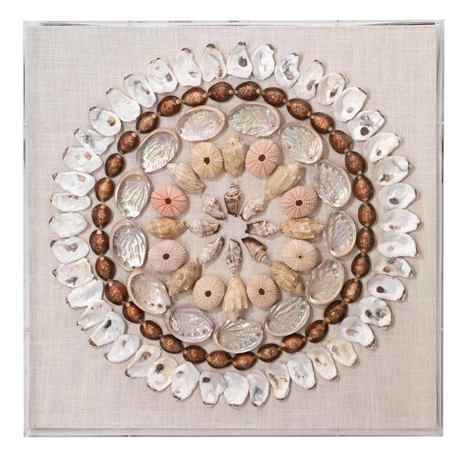 A revolving pattern of unique shell shapes create a circular pattern of organic beauty. Natural colors and textures of radiate outward while drawing you into this stunner from the sea. As if this wall art piece washed ashore, specifically for your wall.