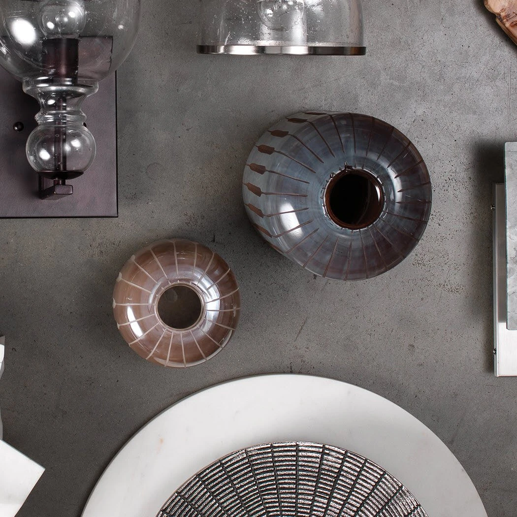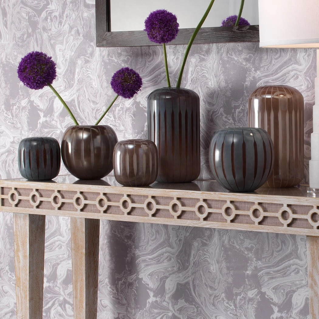 This glass collection has beautiful Midcentury Modern inspired lines etched in colorful glass. Subtle colored undertones are revealed through the etched midnight blue and mauve finished glass, making any flower arrangement the perfect accent to any of the three available sizes. Finish will vary, color will vary. Footprint: 4″dia. Vase opening: 2″dia.