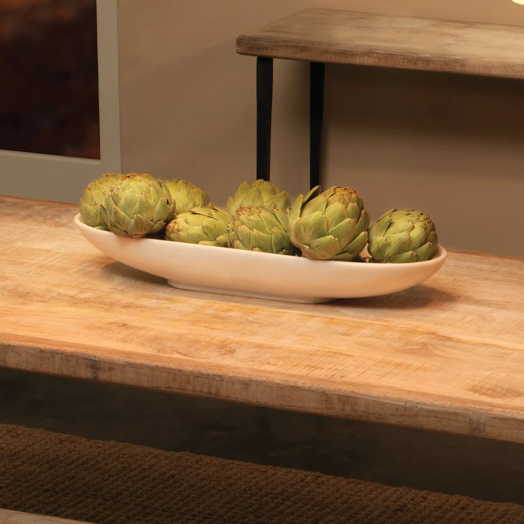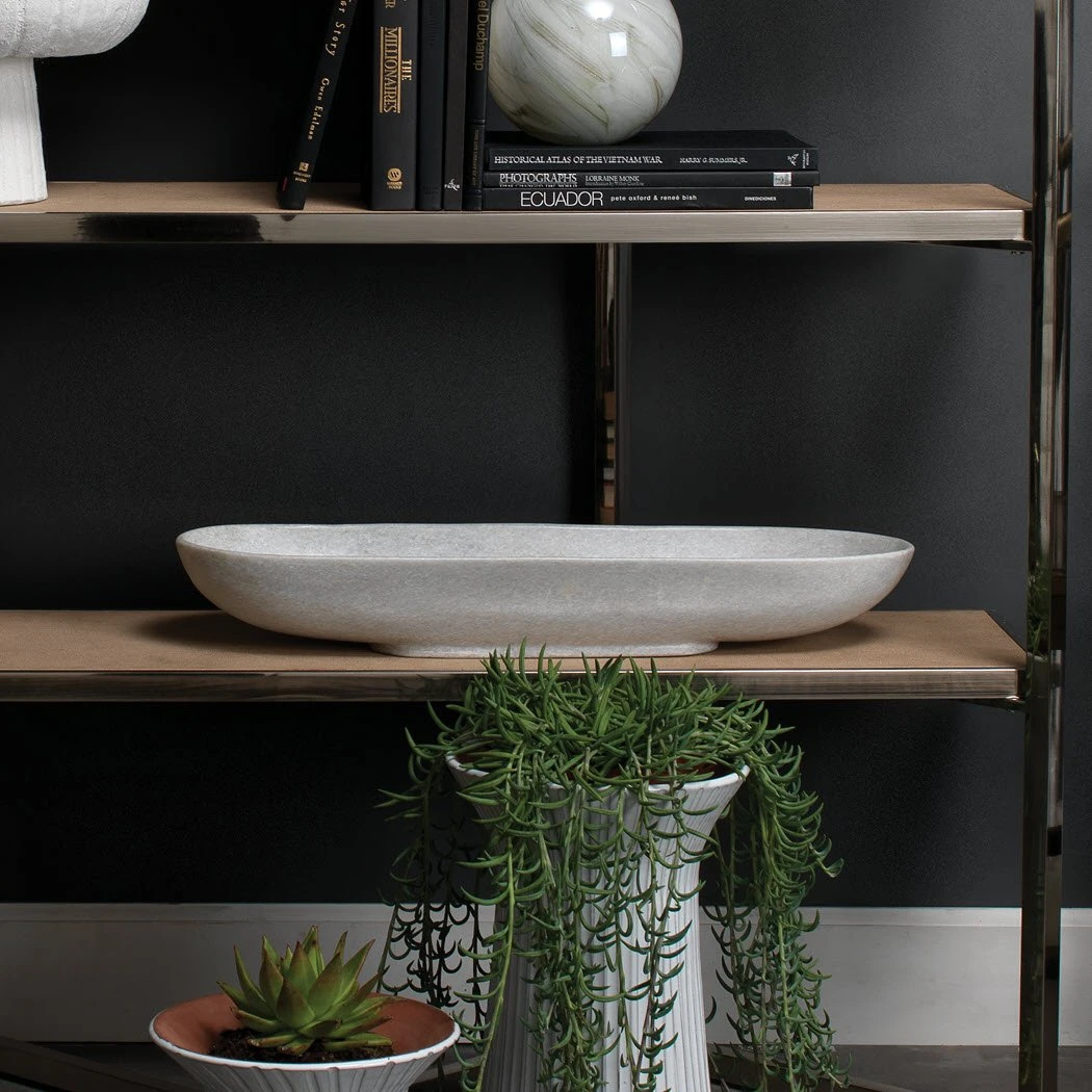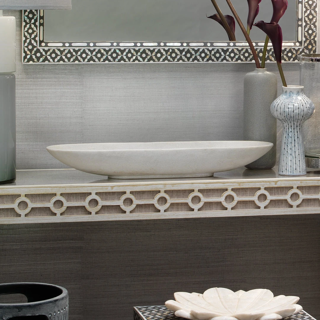 Simple and smooth, the White Marble Oval Bowl is an eye-catching piece that truly stands out in any space. Crafted from solid material with a hollow basin silhouette, this contemporary piece displays Southeast Asian design sensibility for exotic charm. For a visual statement, place it upon a console or dining table and fill with colorful ornaments.