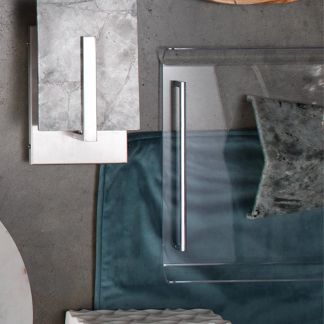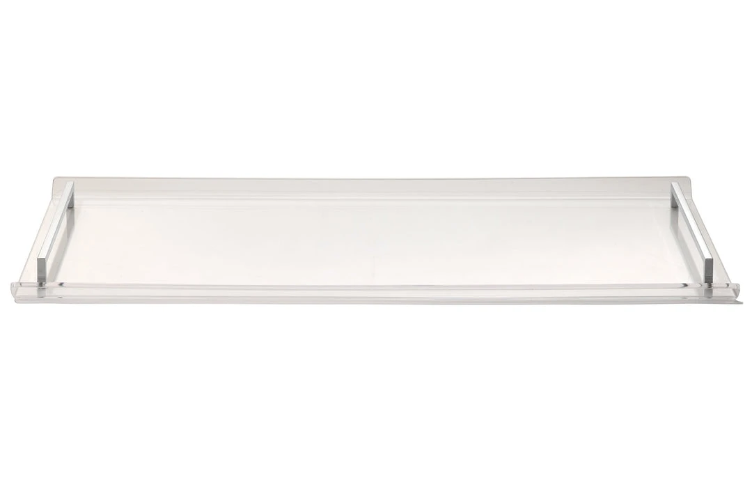 Clear acrylic and grand scale give this tray a home on any large coffee table. Modern finishes paired with simplistic lines give our Lucille Tray a contemporary esthetic that can be placed in any eclectic environment. Chrome handles measure 10.25″l x 1″h. Acrylic is 6mm thick.