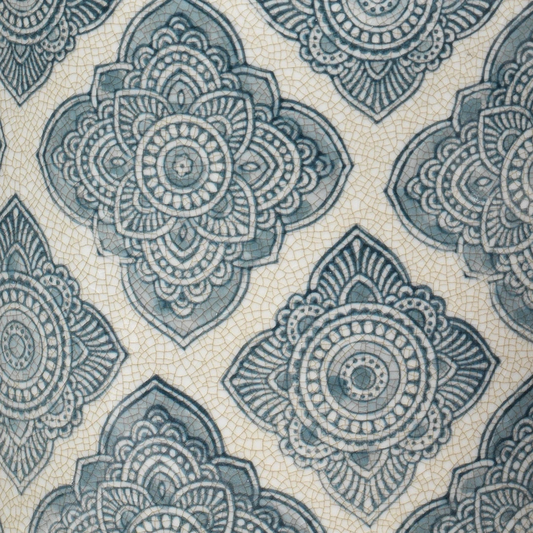 This cannister is a simple contemporary column shape in a sophisticated Arabic indigo pattern, repeated over a bone white porcelain background.