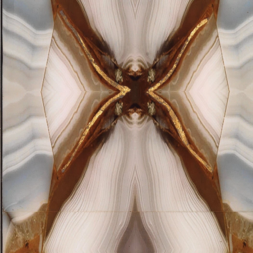 The design of this alluring wall art piece is taken from photos of agate repeated in a way that gives the impression of looking through a kaleidoscope. The hand applied gold leafing adds another layer to create this incredible finish.