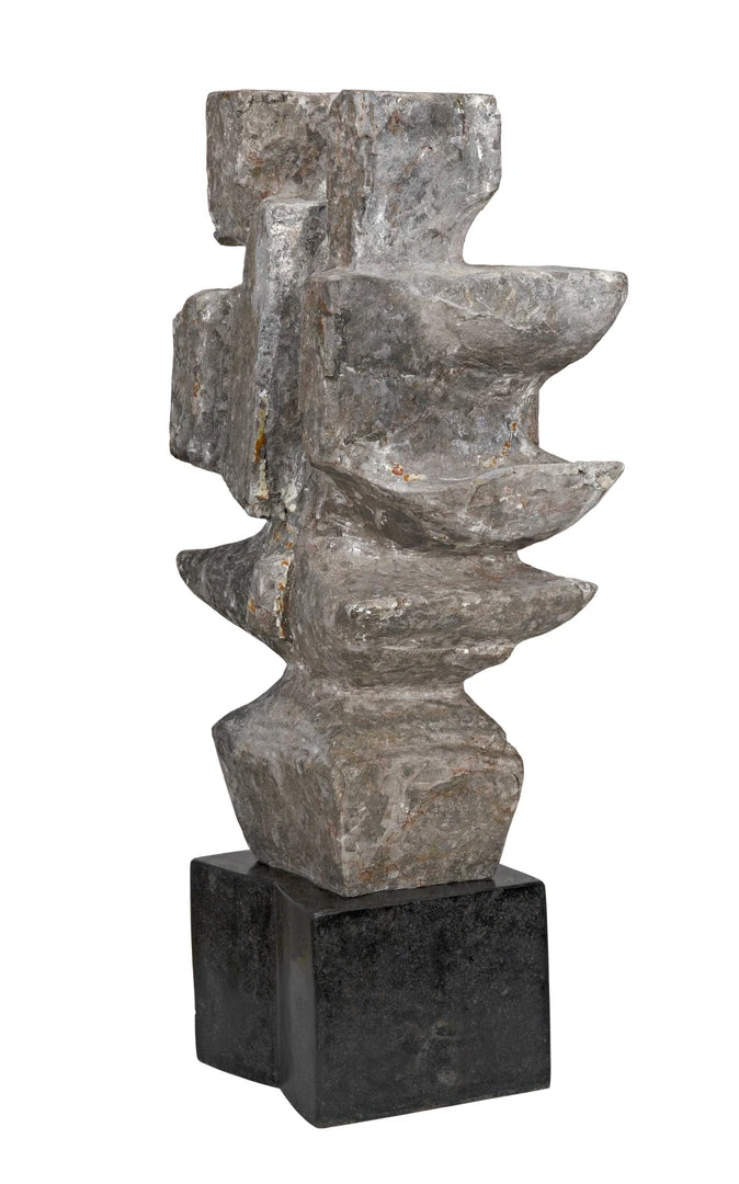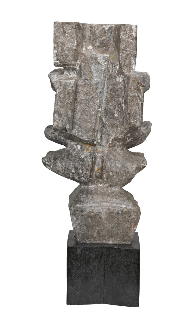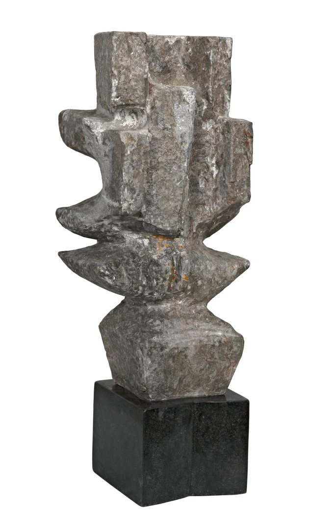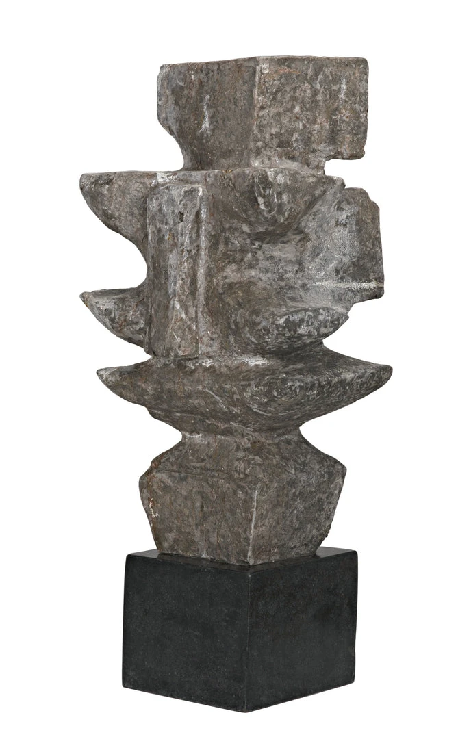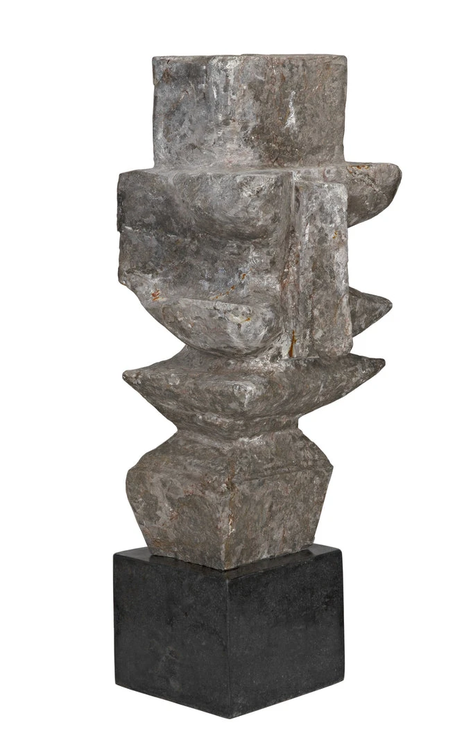 The unrivaled beauty of natural stone shines in this intriguing sculpture. The sophisticated accent piece is organic and amorphous, inviting contemplation and personal interpretation. Artisan crafted of grey stone with a black marble base; these accent pieces were designed with simple lines to allow the natural material center stage. The stone we work with was chosen for the beauty of its natural striations and veining. No two pieces of stone the same, and each of our objects will therefore be unique to themselves.