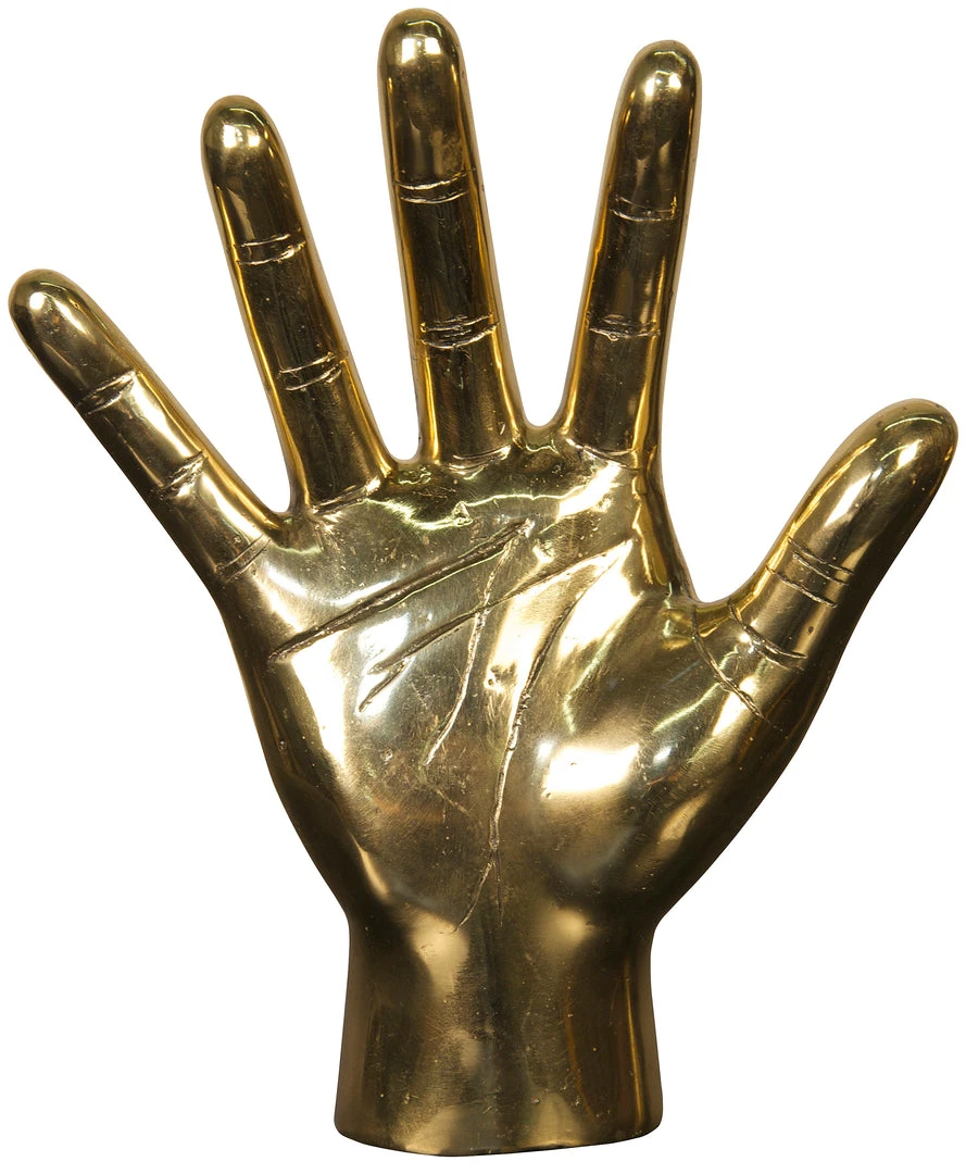 An open hand is rendered simply in an expertly weathered warm antique finish. Featuring raw, stylized lines, this intriguing brass sculpture is the perfect piece to add interest to any modern decor. Handcrafted of brass, no two will be identical.