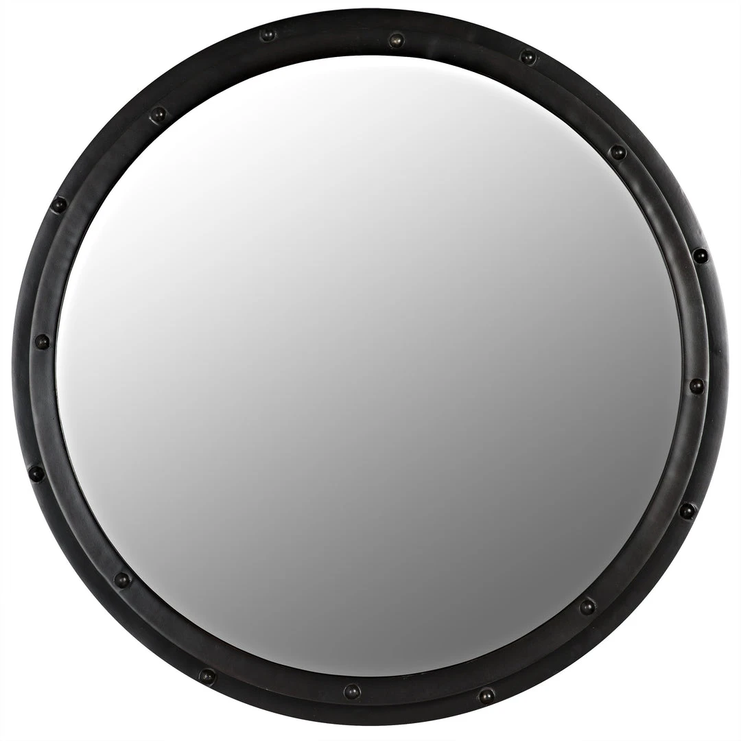 A classic round mirror in metal is adorned simply with exposed rivets for an urban look ideal for a sophisticated decor.