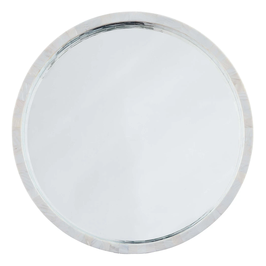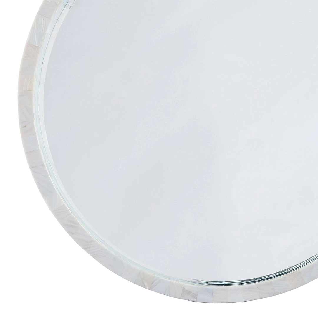 Ivory mother of pearl edges surround this modern mirror, lending a touch of subtle multi color and natural beauty. Versatile and timeless, this piece is perfect for brightening up your space.