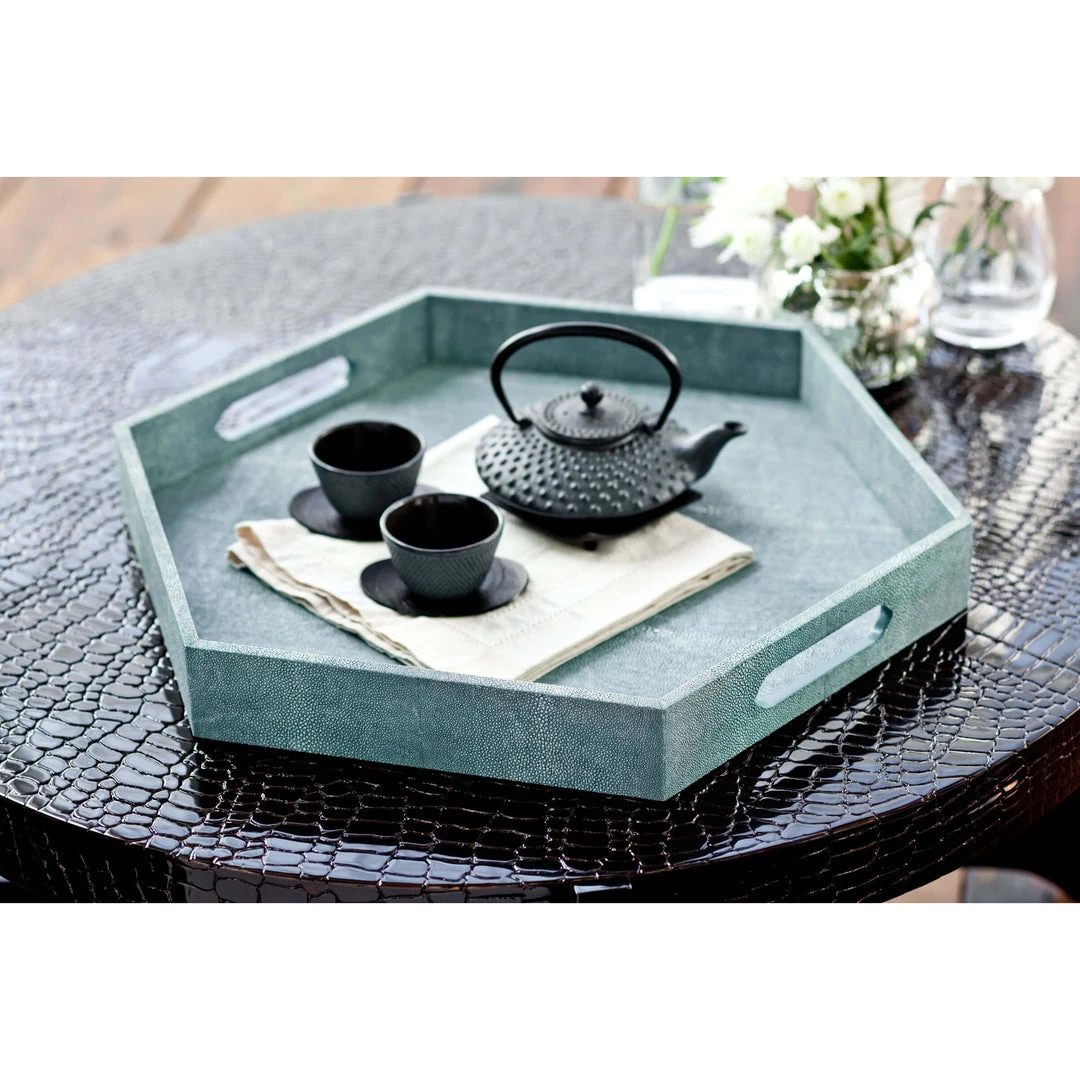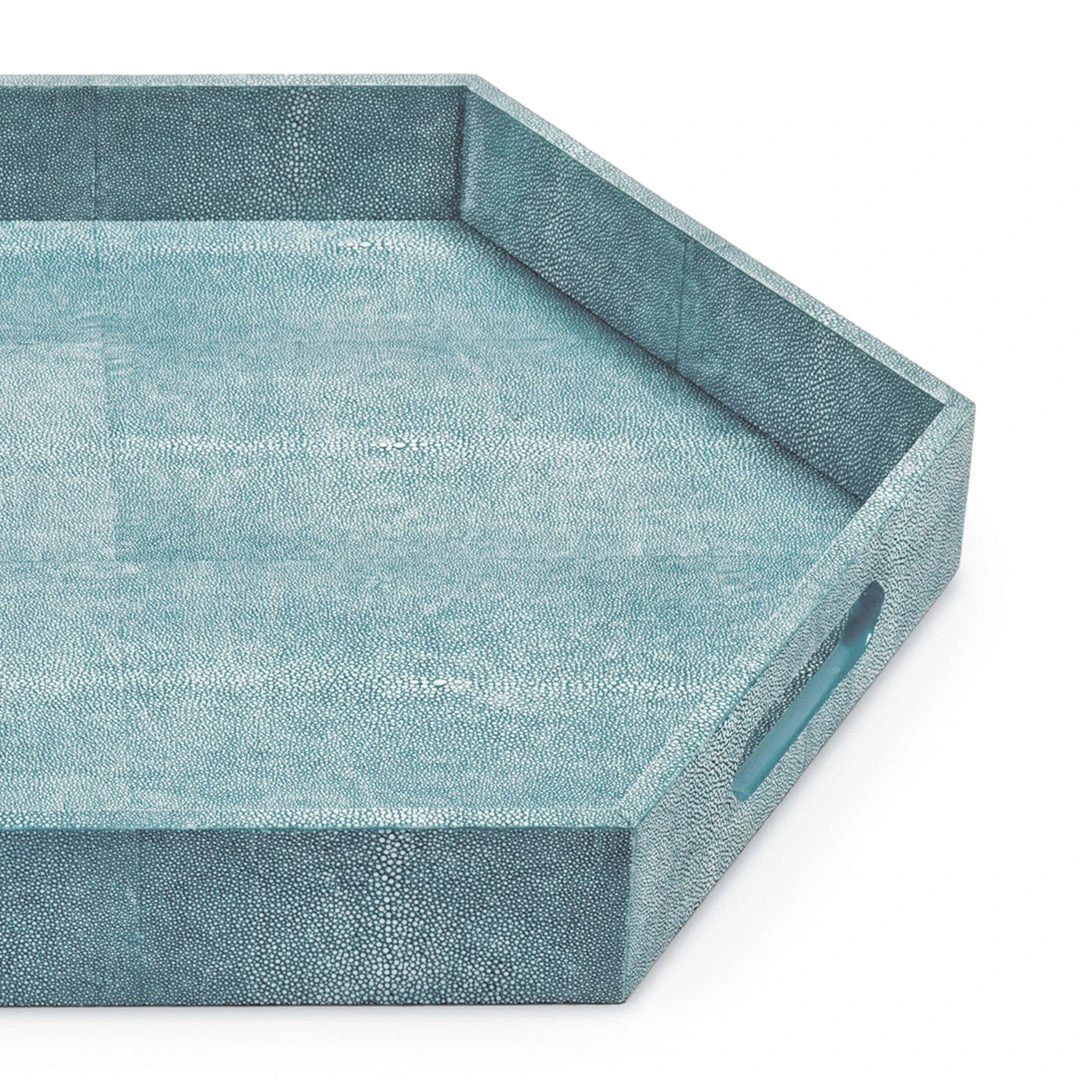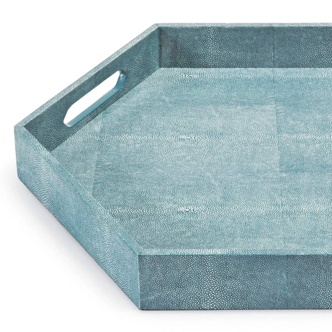 Wrapped in a vivid turquoise faux shagreen, this hexagonal tray will meet your serving or display needs. Also available in two other finishes.