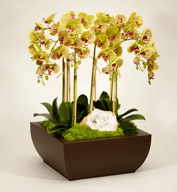 Phalaenopsis orchids gathered into a metal aluminum box with preserved mosses and a substantial piece of crystal quartz geode.