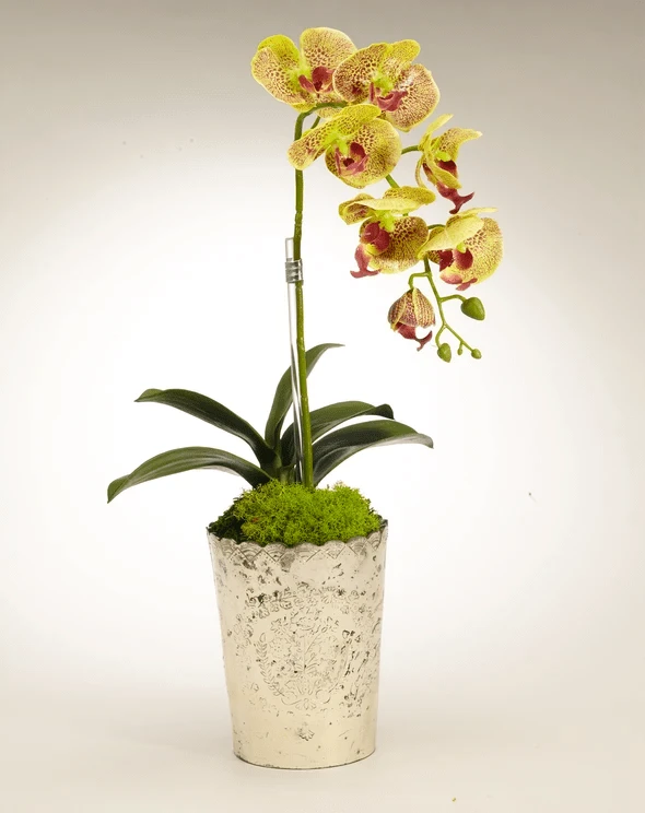 Phalaenopsis orchid nestled in preserved moss and placed into a vintage ceramic mercury glass.