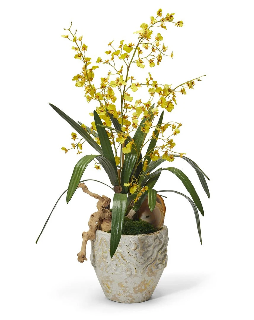 Yellow Oncidium orchids, also known as dancing orchids, potted in a glided light weight paper mache container. Accented with 2 agate slabs, grape wood and preserved moss’s.