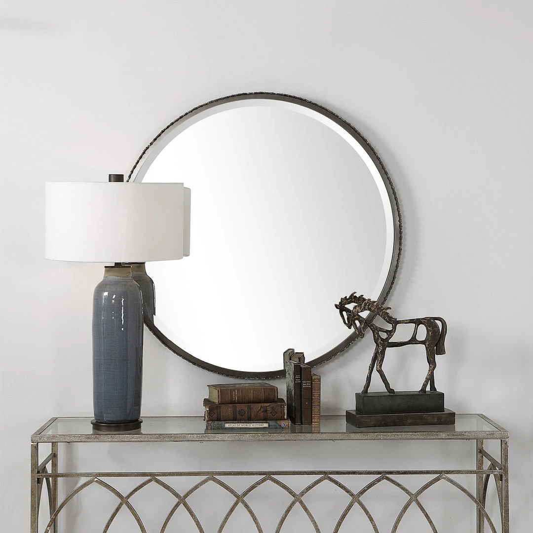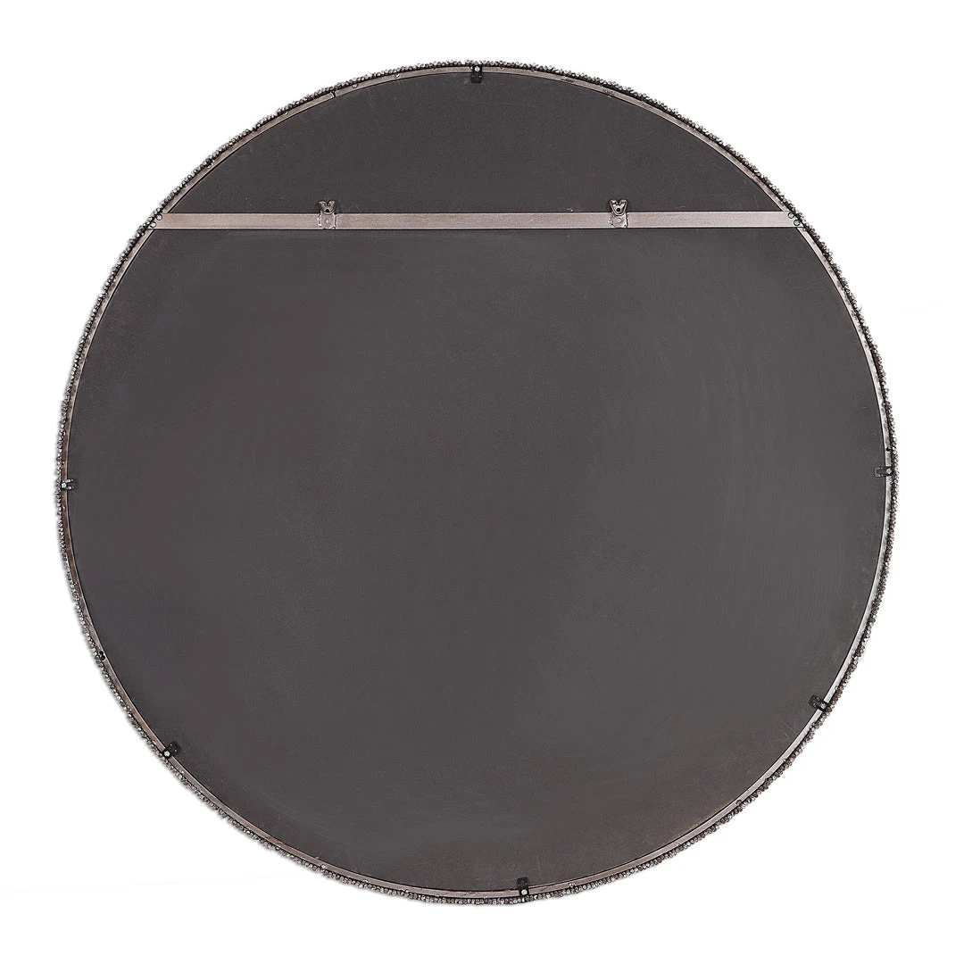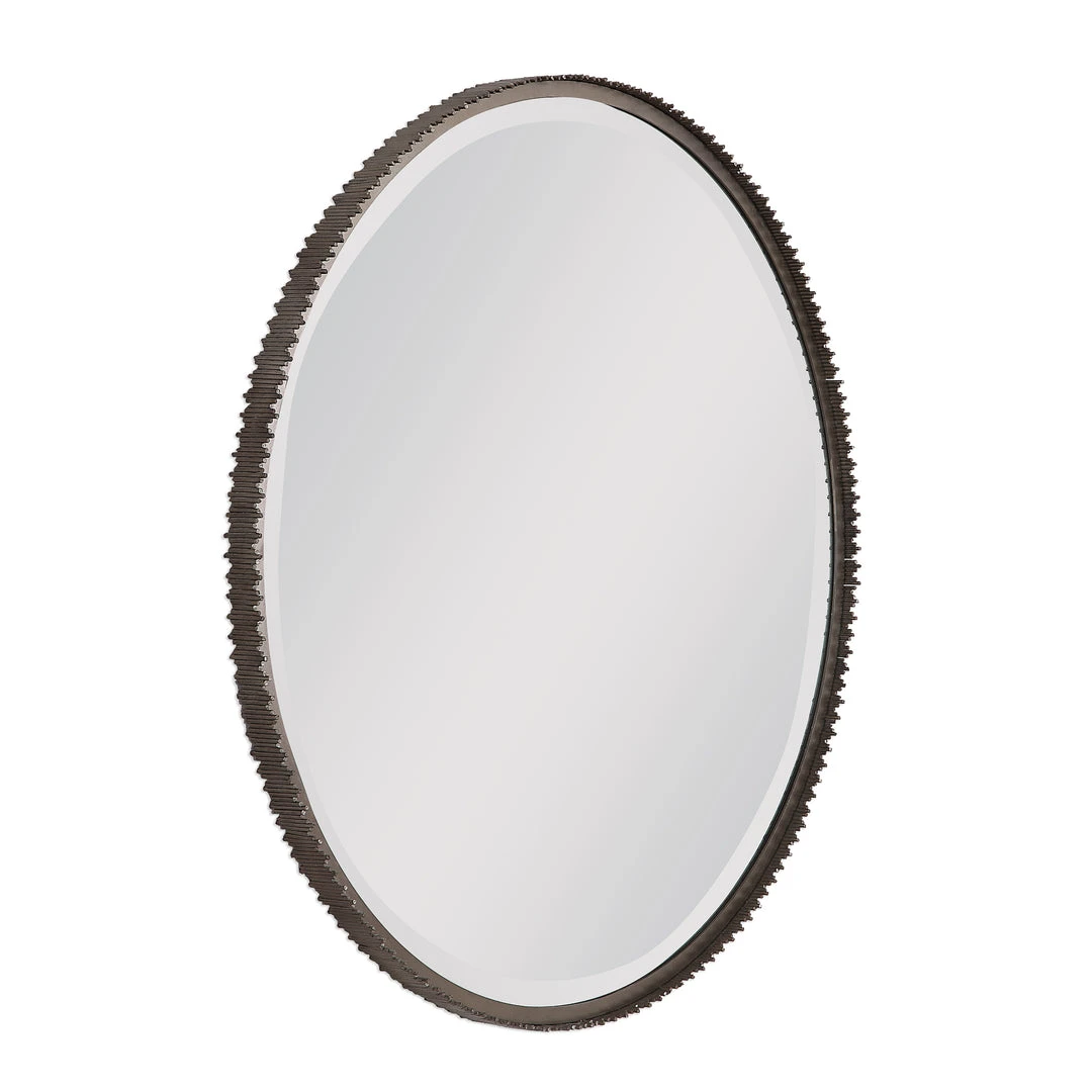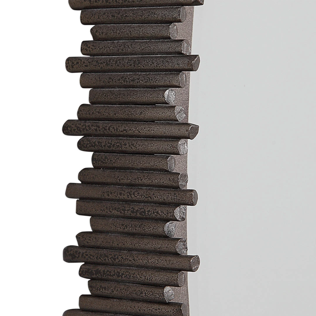 This 3-dimensional Contemporary Mirror Features Hand Cut Iron Dowels In Varying Lengths Welded To The Outer Edge Of The Frame, Finished In A Burnished Steel Silver. The Mirror Is Surrounded By A Considerable 1 1/4″ Bevel.