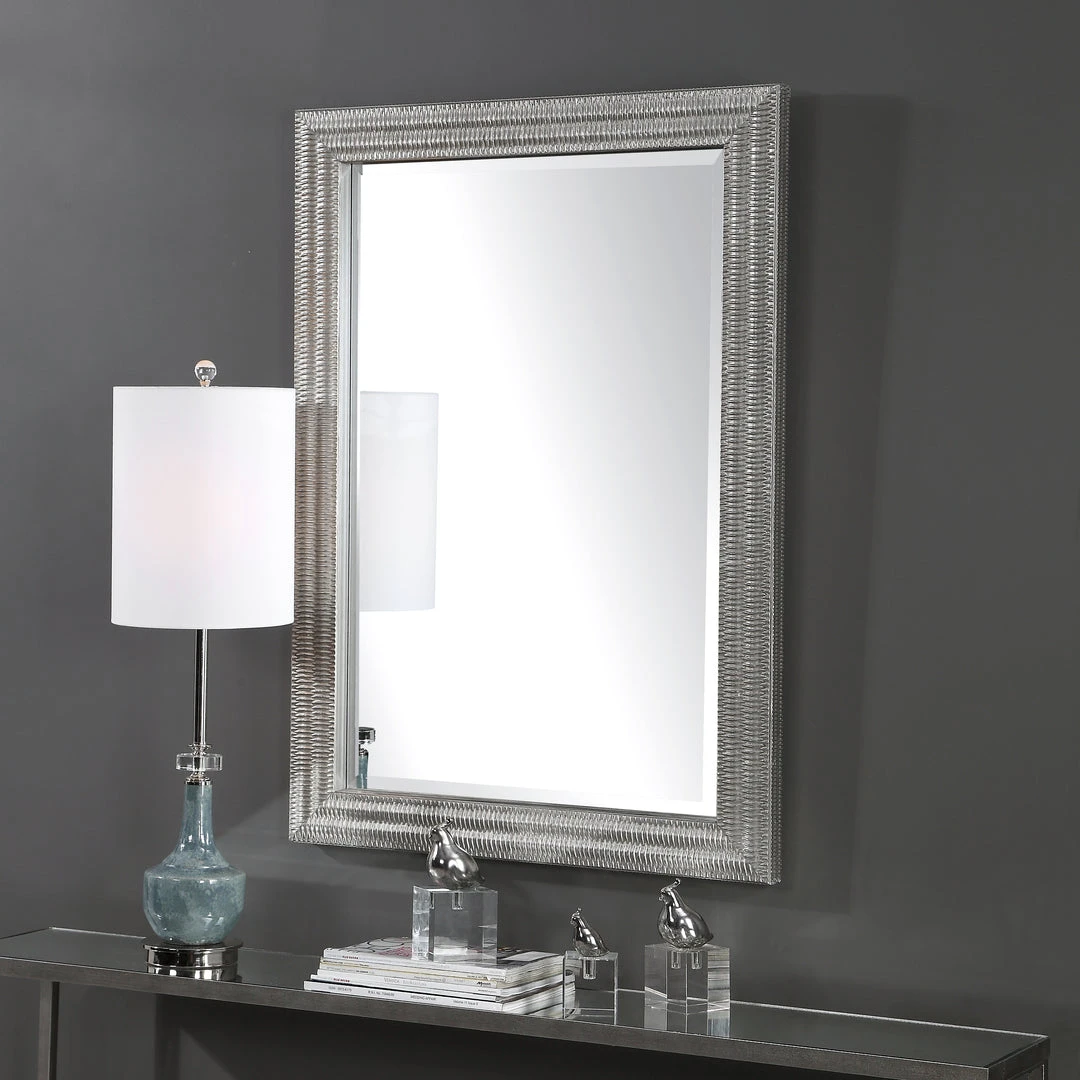 This Mirror Is Finished In Silver Leaf With Woven Texture That Adds Visual Interest. The Mirror Has A 1″ Bevel And May Be Hung Horizontal Or Vertical.