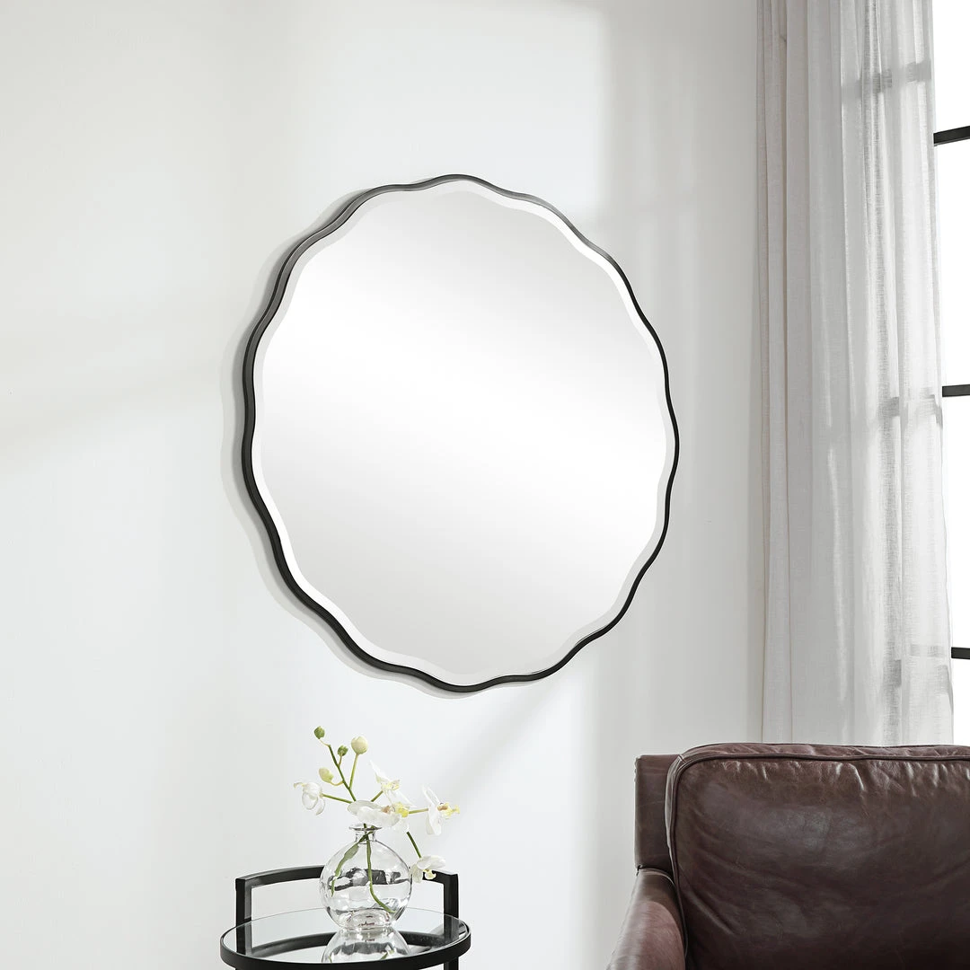 Showcasing A Feminine Scalloped Edge, This Shaped Wood Mirror Adds Whimsical Flair To Any Design. The Mirror Is Finished In Satin Black And Has A 1 1/4″ Bevel.