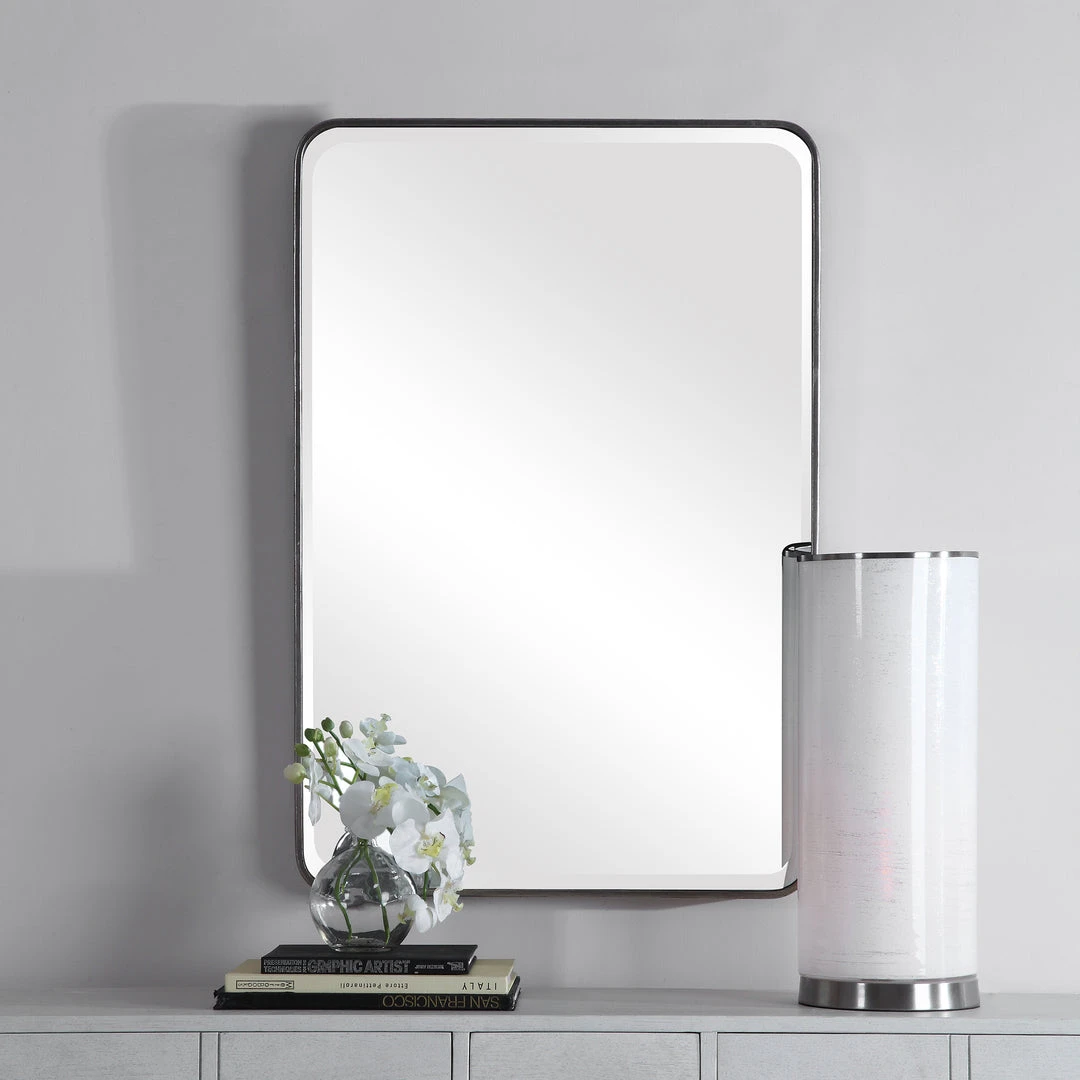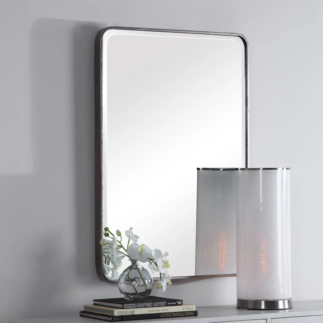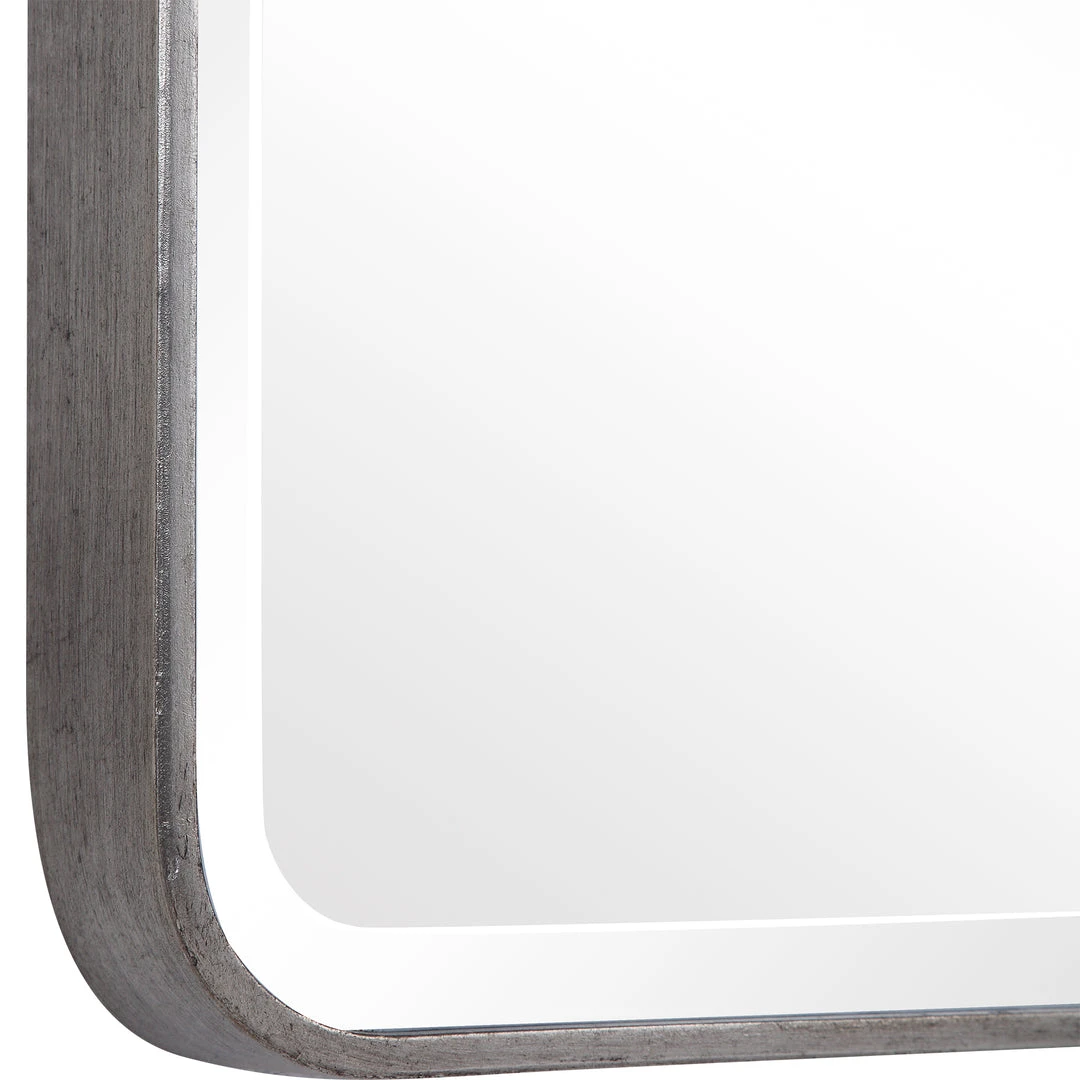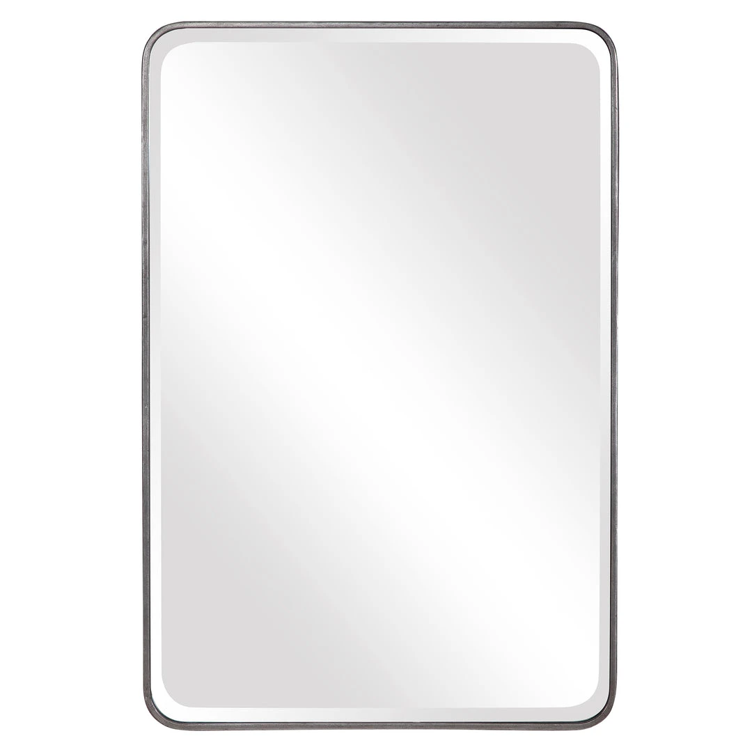This Iron Frame Is Finished In Lightly Distressed Silver Leaf Featuring Gracefully Curved Corners, And A Generous 1 1/4″ Bevel. May Be Hung Horizontal Or Vertical.