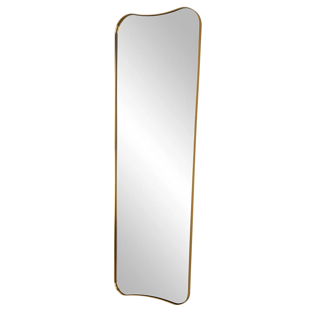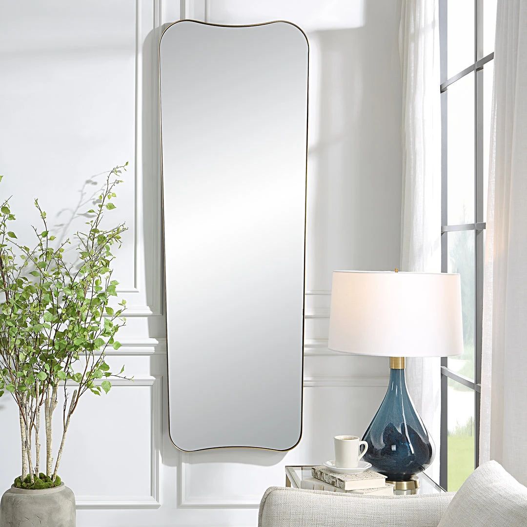 This Oversized Mirror Features A Sophisticated Stainless Steel Frame Finished In A Rich Antique Brass. The Curved Silhouette Adds A Contemporary Feel To This Piece.