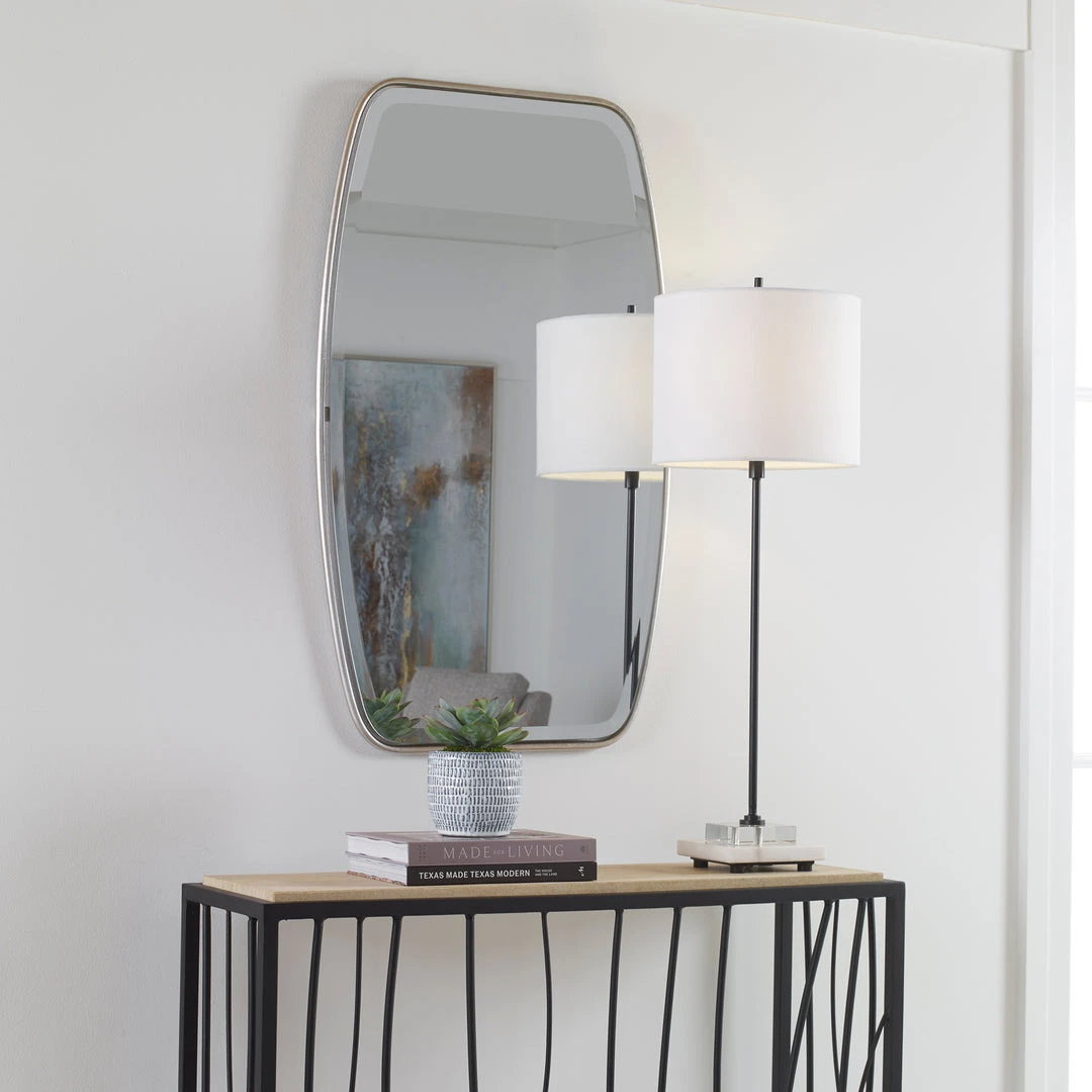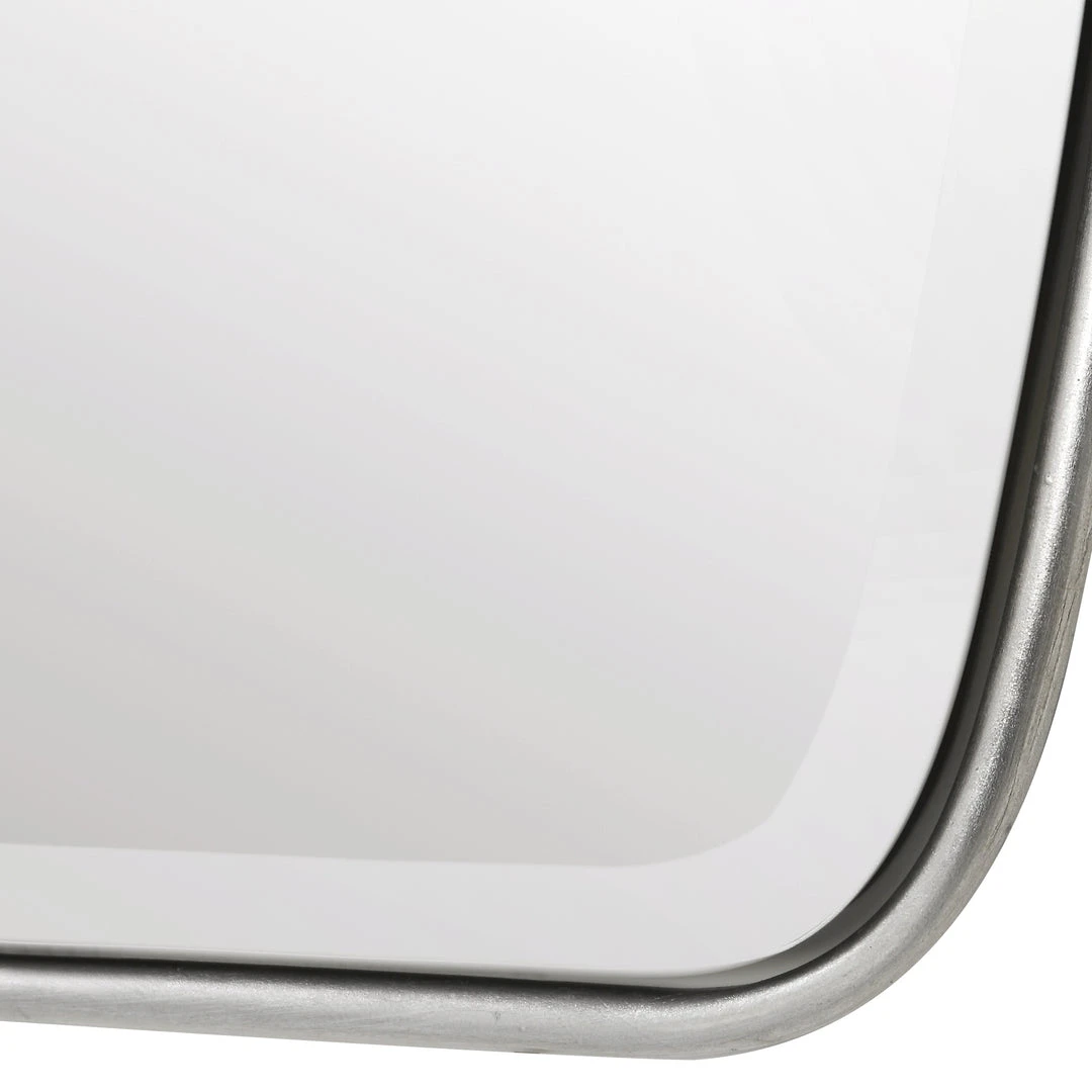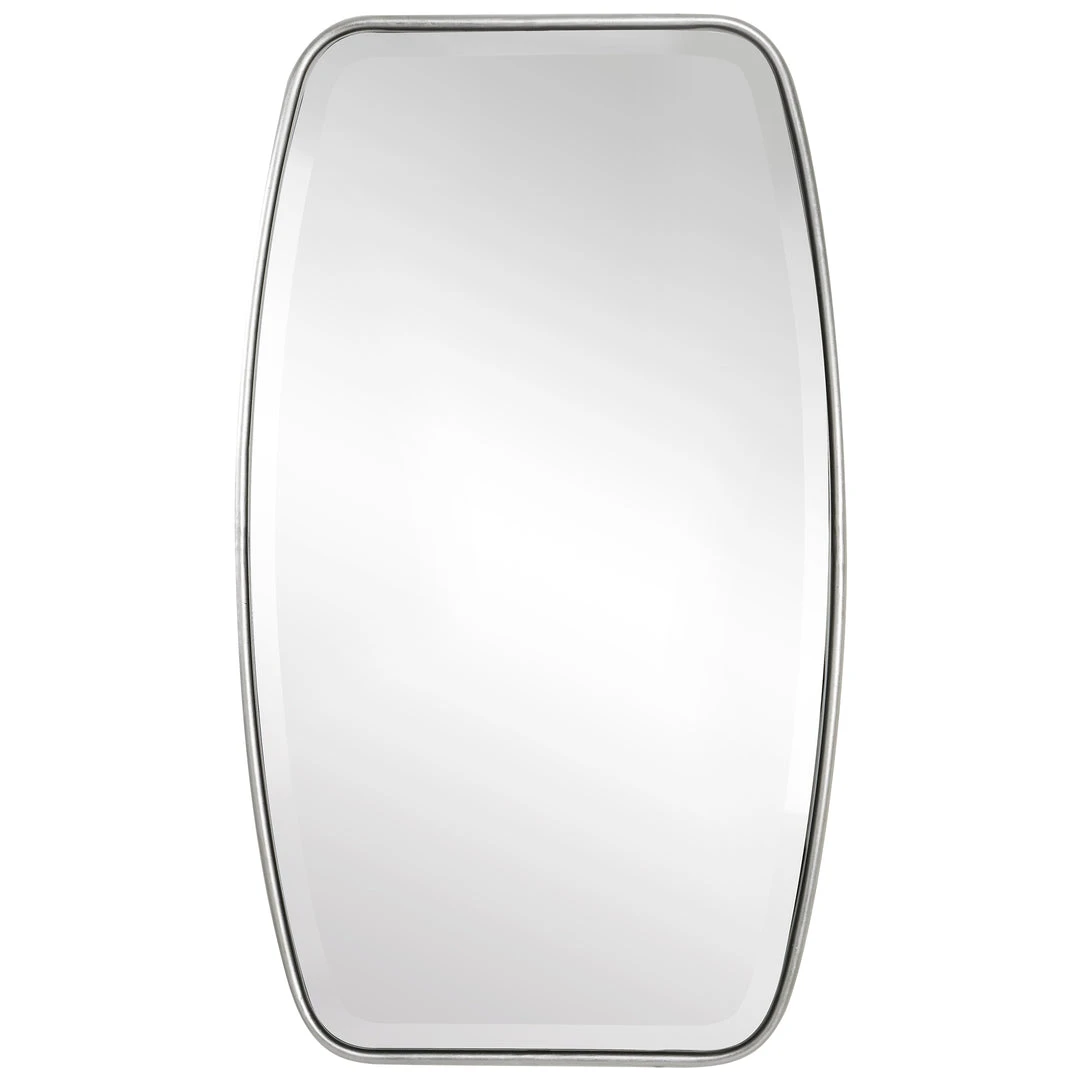 This Shaped Mirror Frame Is Forged From Rounded Metal Finished In A Lightly Antiqued Silver Leaf Featuring A Floating Beveled Mirror. May Be Hung Horizontal Or Vertical.