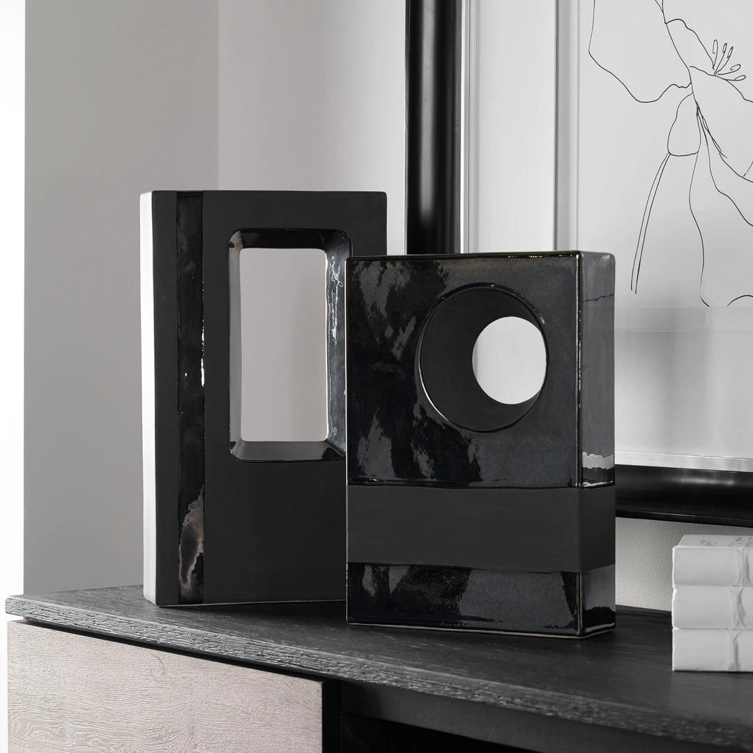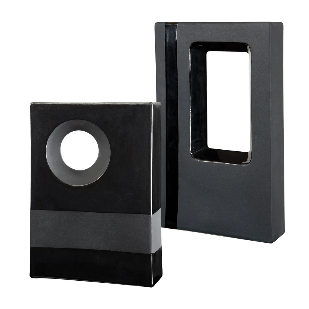 Modern Earthenware Accents Feature A Matte Gray Glaze With Gloss Black Accents. Sizes-S-12x14x2, L-12x17x2