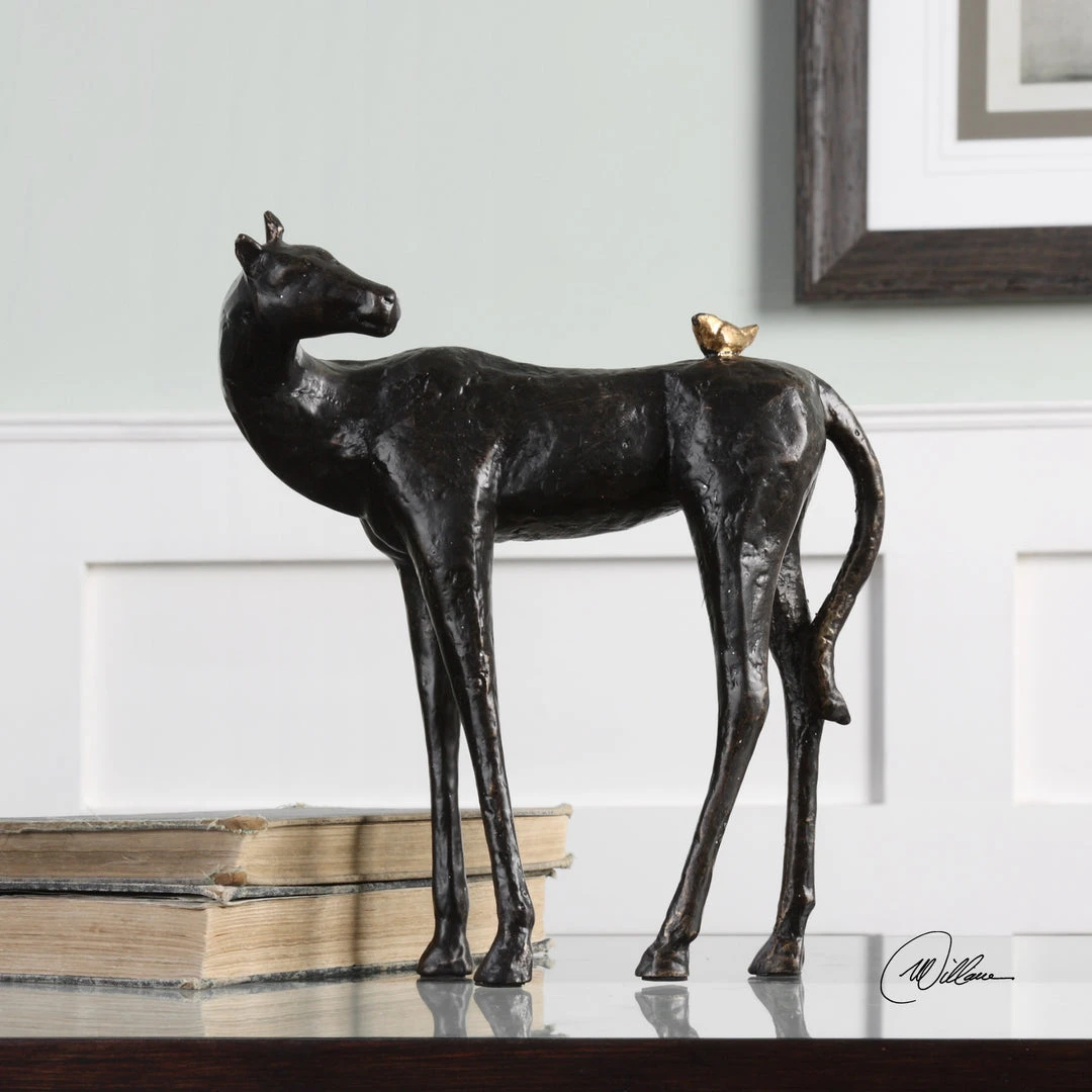 This Playful, Cast Iron, Sculpture Features A Dark Brown Horse With Light Bronze Tipping Turned To Greet The Antique Gold Bird That Has Positioned Itself On His Back. This Will Add A Cheerful Addition To Any Setting.