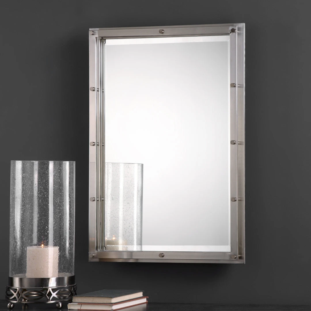 Multi-layered Steel Frame Finished In Plated Brushed Nickel. Mirror Has A Generous 1 1/4″ Bevel. May Be Hung Horizontal Or Vertical.