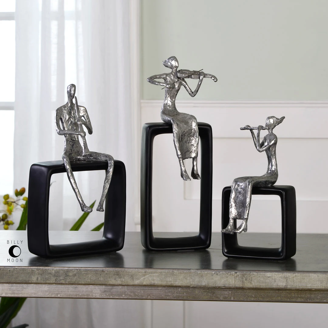 Artistic Musicians Hard At Work. Musicians Are Cast In Aluminum, And Feature A Textured, Silver Plated Finish. Each Musician Is Resting On A Matte Black Base, Perfect For A Coffee Table Conversation Piece, A Bookshelf Or Foyer Table. Sizes: S-5x6x10, M-7x6x13, L-6x5x15