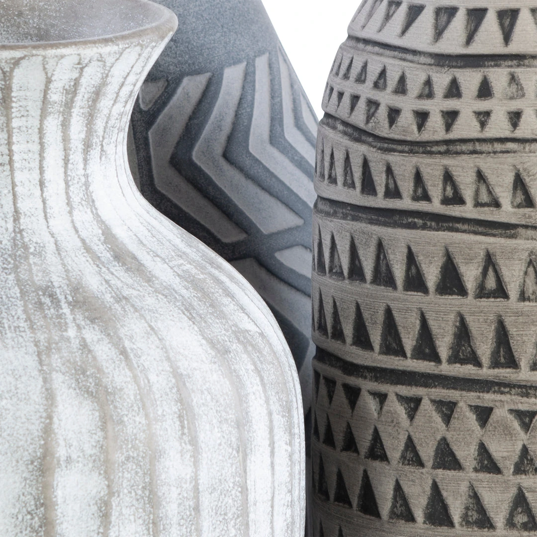 Set Of Three Earthenware Vases Are Finished In Light Gray, Charcoal, And Natural Beige With Etched Geometric Patterns. Sizes: S-7x12x7, M-10x13x10, L-7x18x7