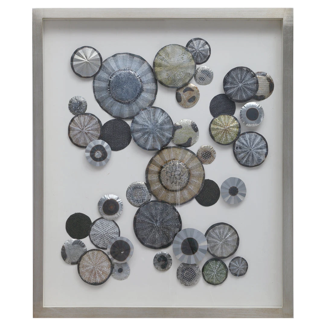 Abstract Wall Art Features Overlapping, Blow Torched Textured Iron Discs In Tones Of Silver, Charcoal, Rust, Blue, And Green. The Art Is Under Glass And Is Encased By A Lightly Antiqued Silver Leaf Shadow Box. May Be Hung Horizontal Or Vertical.