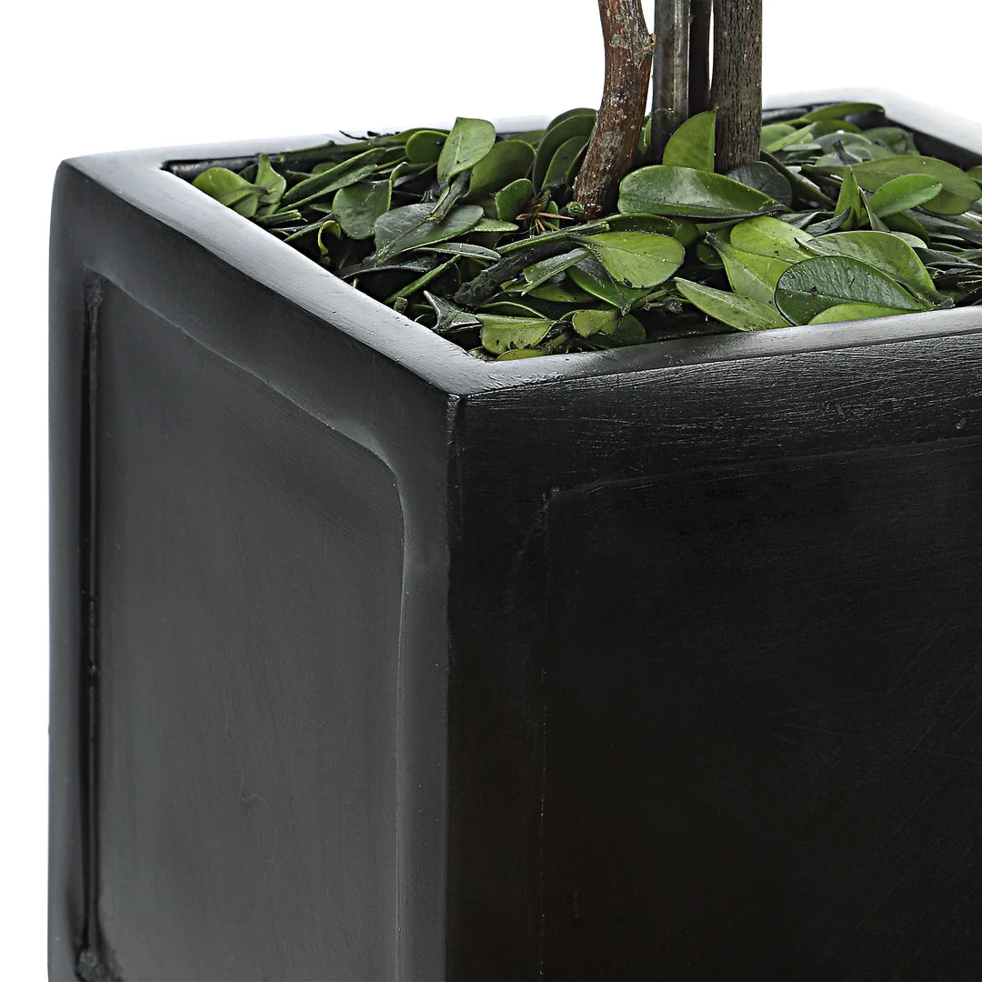 Natural Evergreen Foliage Preserved While Freshly Picked, Looks And Feels Like Living Boxwood. Supported By Natural Willow Branches, Two Square Topiaries Are Potted In Contemporary Ball Footed Planters Finished In Satin Black.