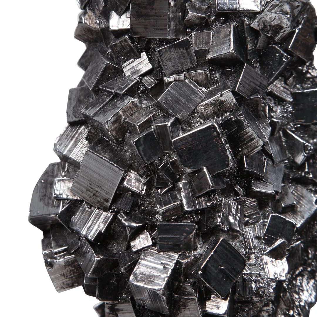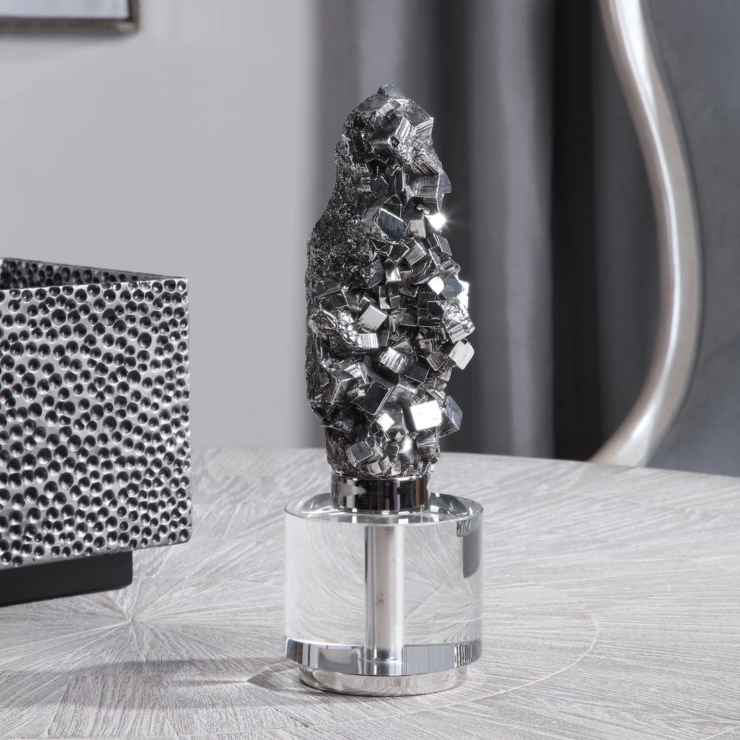 Unique Sculpture Showcases A Cast Pyrite Stone, Otherwise Known As “fools Gold.” The Sculpture Is Finished In Platinum Silver With An Elegant Crystal Base.