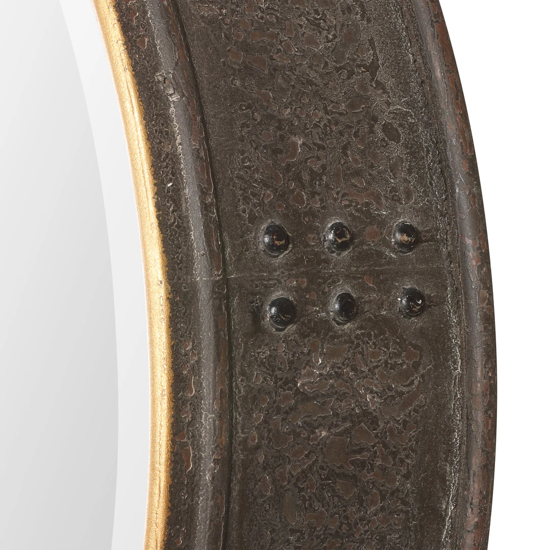 This Iron Frame Features A Petite, Antiqued Gold Front Edge, Paired With Tapered Deep Side Thats Finished In A Rustic Dark Bronze With A Rottenstone Wash And Exposed Nail Heads. Mirror Features A Generous 1 1/4″ Bevel.