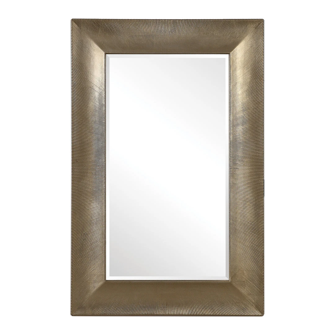 This Elegant Design Features A Gracefully Sloped Surface With A Refined, Channeled Texture, Finished In A Warm Champagne. Mirror Features A Generous 1 1/4″ Bevel. May Be Hung Horizontal Or Vertical.