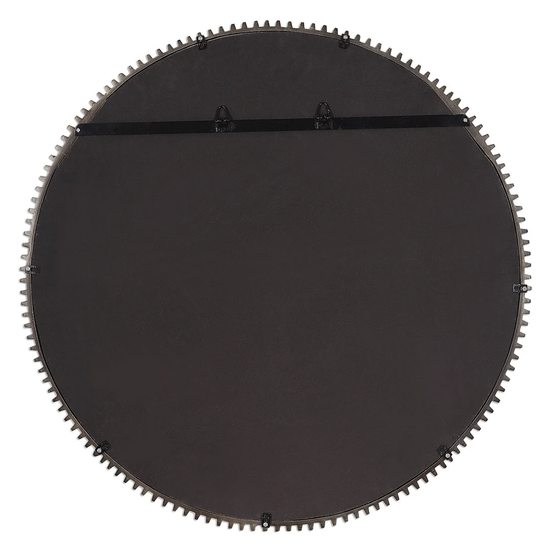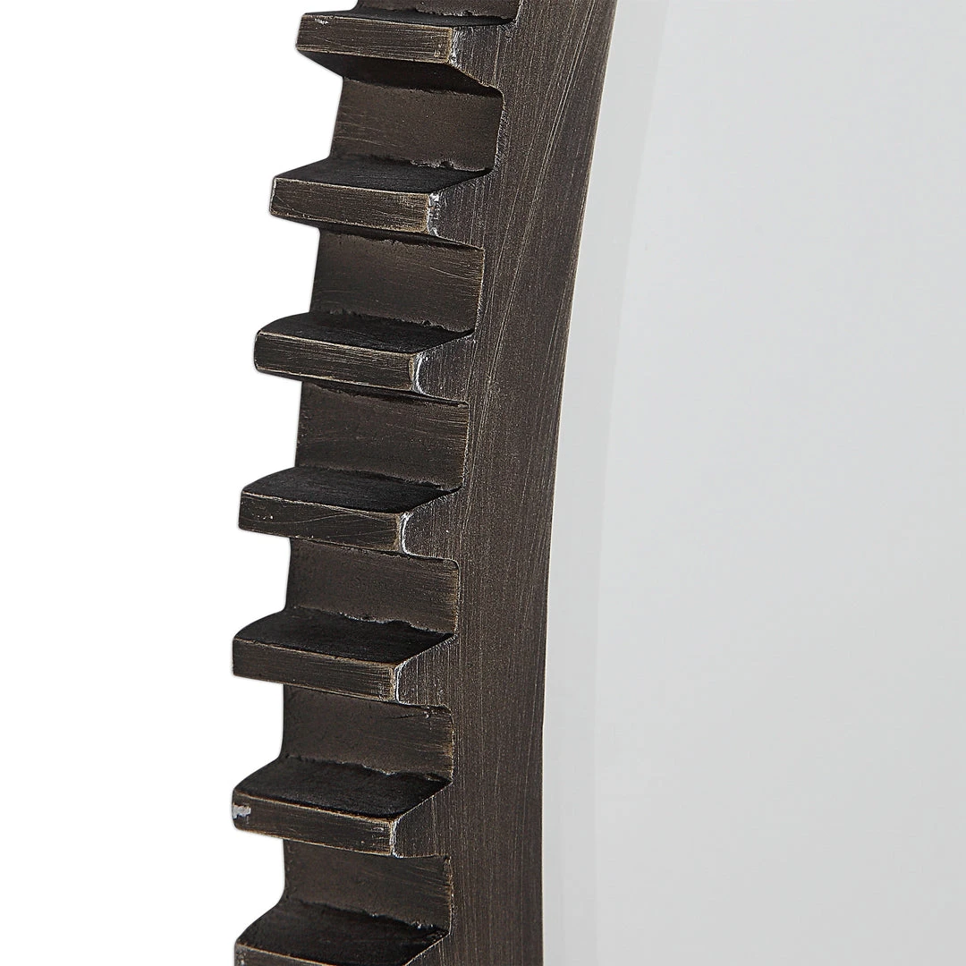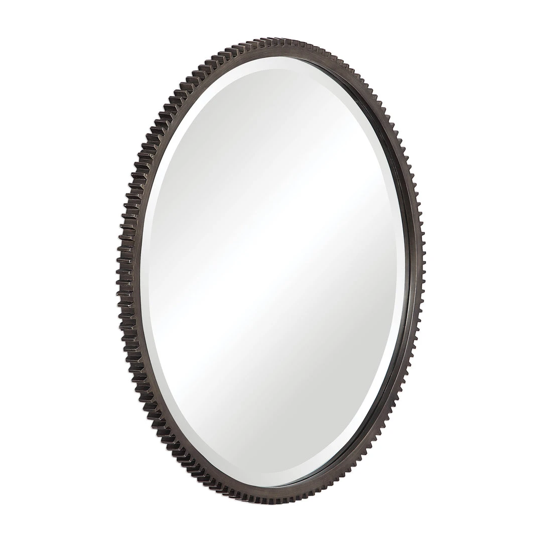 This Piece Showcases An Industrial Take On The Timeless Gear Design. This Mirror Features Notch Detailing On The Entirety Of Its Frame, Finished In A Lightly Distressed Aged Bronze. The Mirror Is Surrounded By A Generous 1 1/4″ Bevel.