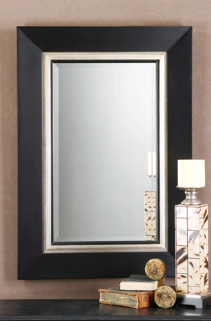 This Solid Wood Frame Features A Smooth, Matte Black Finish. The Frame Is Accented By A Silver Leaf Bead And Rim. A Black Fillet Highlights The Edge Of The Beveled Mirror. May Be Hung Horizontal Or Vertical.