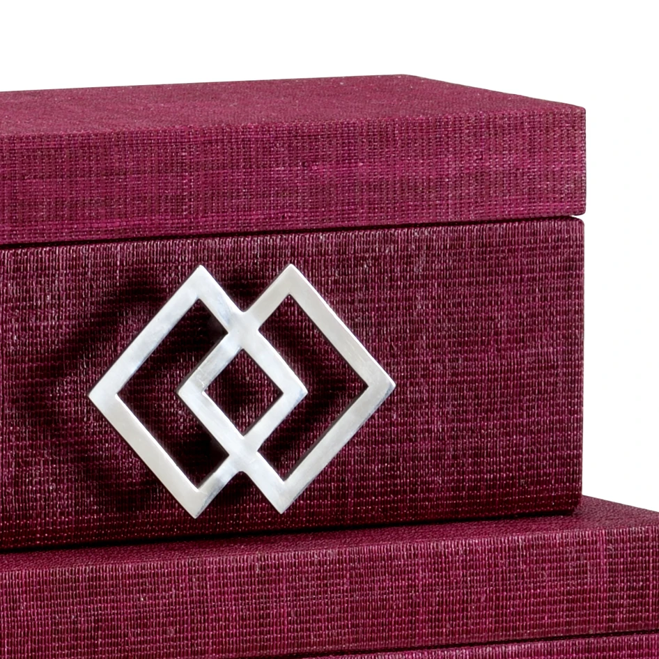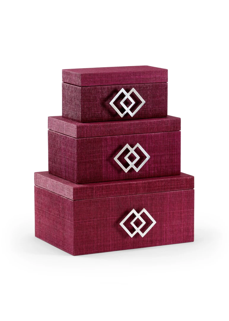 Mulberry Dyed Woven Abaca Set Of Three Nesting Boxes With Brushed Nickel Hardware And A Lined Interior. Small: 5″H X 9.75″W X 5.5″D, Medium: 6″H X 11.75″W X 8″D.