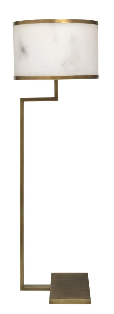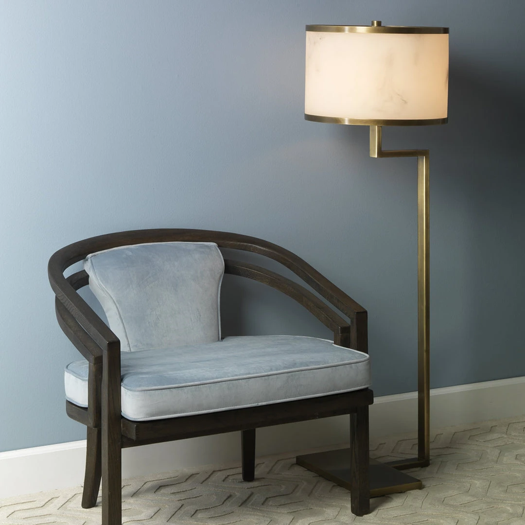 A dramatic faux alabaster drum shade elevates this European inspired floor lamp. Crafted by hand from high quality resin, the delicate swirl patterns and veining of natural stone are recreated individually and are unique to each piece. An extra touch of luxe is added to the shade with antique brass metal trim and we soften the light with an acrylic diffuser. The unexpected angles of this glamorous design don’t simply add style. They allow for enhanced placement options in the home and softly diffused light where you want it most.