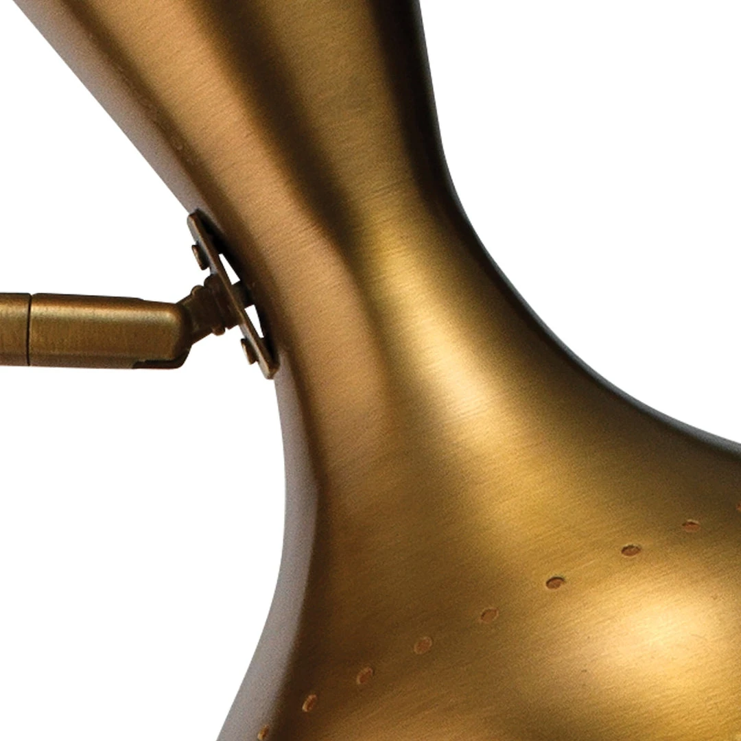 This mid century inspired task lamp has an hourglass hood with two directional sockets. One upward socket and one downward within the swivel hood make it easy to direct light for a great working environment. The antique brass silhouette creates a classic, modern and contemporary look, perfect for any desk.