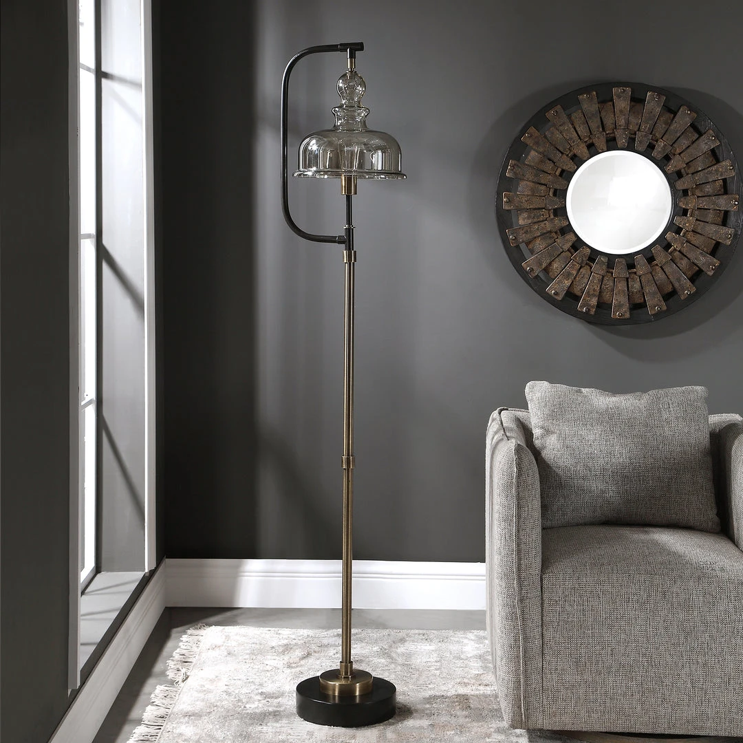 This Floor Lamp Features A Delicate Design Finished In A Plated Antiqued Brushed Brass And Rusted Aged Black. The Piece Showcases A Gracefully Curved Light Amber Glass Shade And Includes One 60 Watt, BT-58 Antique Style Bulb.