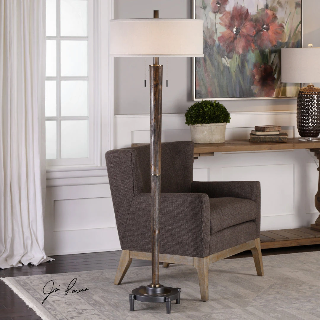 Tapered Columns Made Of Plantation Grown Hardwood, Finished In A Lightly Burnished Oak Stain, Accented With Plated Antique Brass Highlights And Rust Black Details. The Round Hardback Drum Shade Is A Light Oatmeal Linen Fabric With Natural Slubbing.