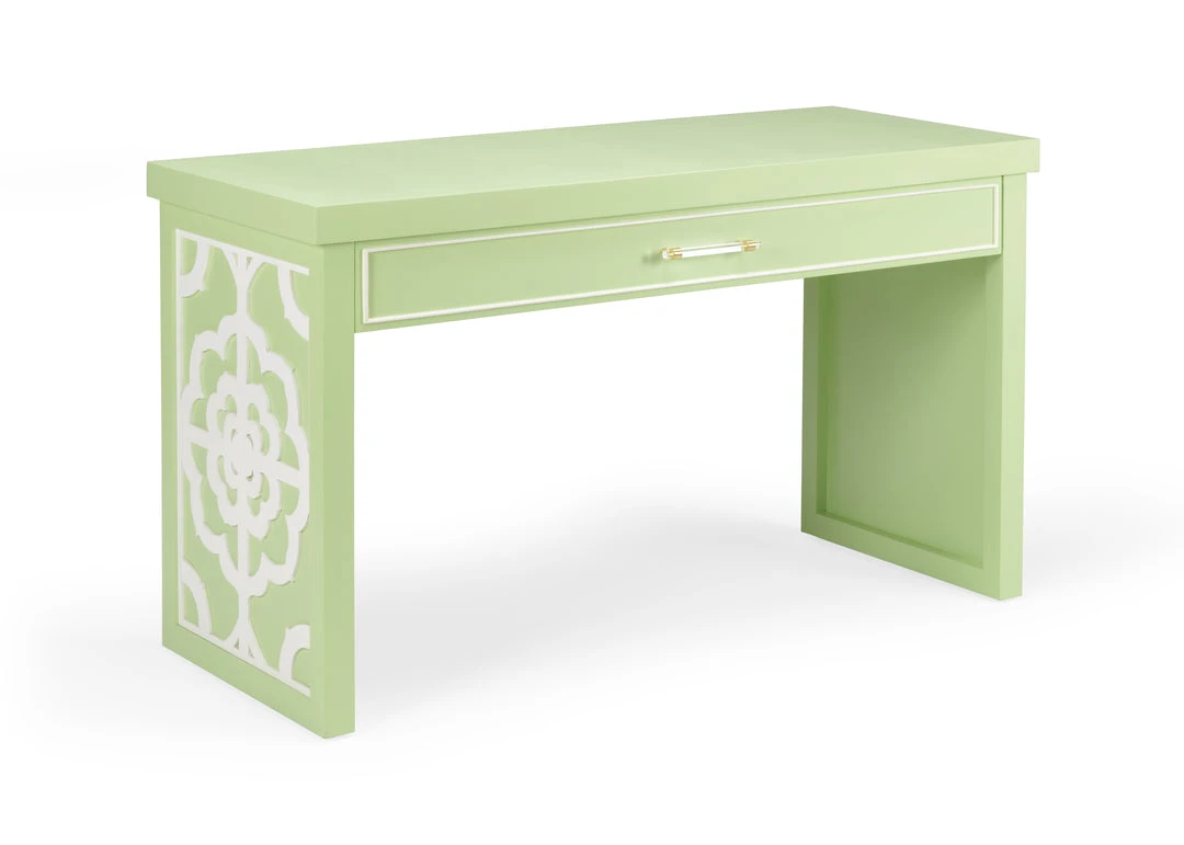 A Modern Take On A Vanity Transitioning Effortlessly To A Writing Desk Or Sofa Table. Featuring A Charming White Geometric Floral Side Panel. The Piece Is Great For Home Or Office. Not Intended For Clothing Storage. Designed By Shayla Copas.