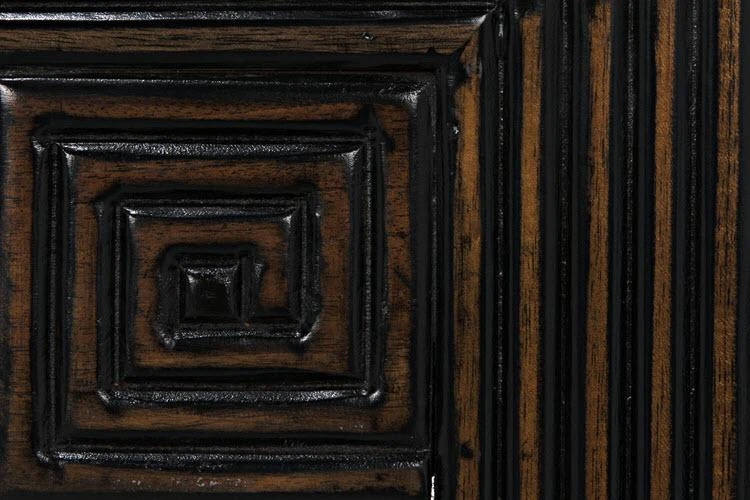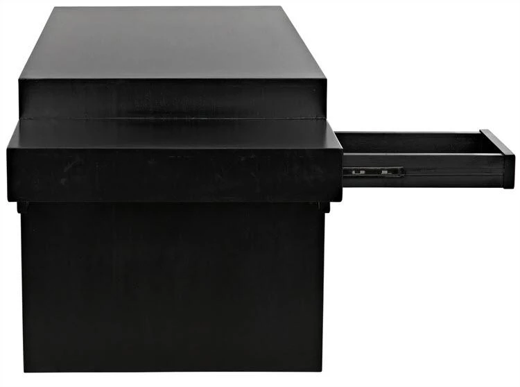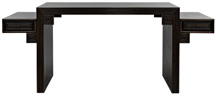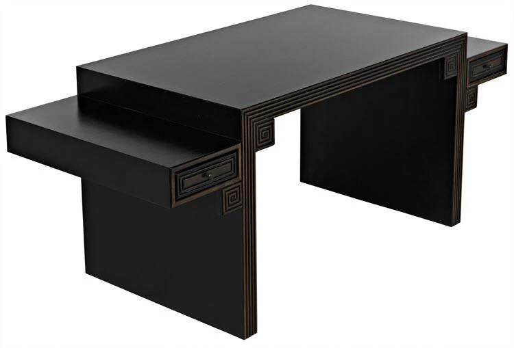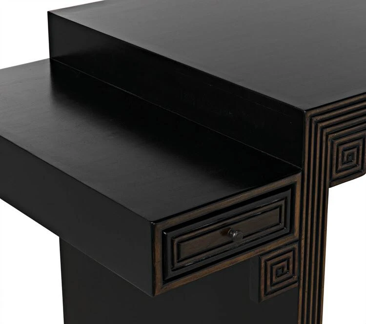 The essence of elegance, this two-drawered mahogany desk is finished by in a rich hand-rubbed black. Its lines are graced with carved details enhanced with brown accents that create an ideal contrast. Entirely artisan crafted, this is desk perfect for any distinguished d_cor.