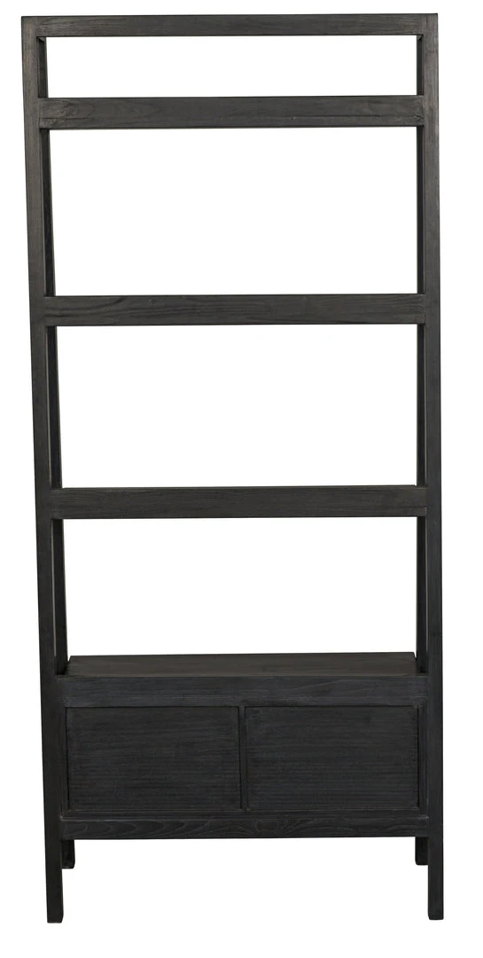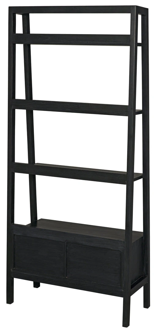 A simple A frame shelving unit elated by expert craftsmanship and sophisticated details. Hand-carved of sungkai wood, each of the two available finishes, charcoal black and natural, honor the characteristics of the wood and include the natural grains and swirls in the design.
