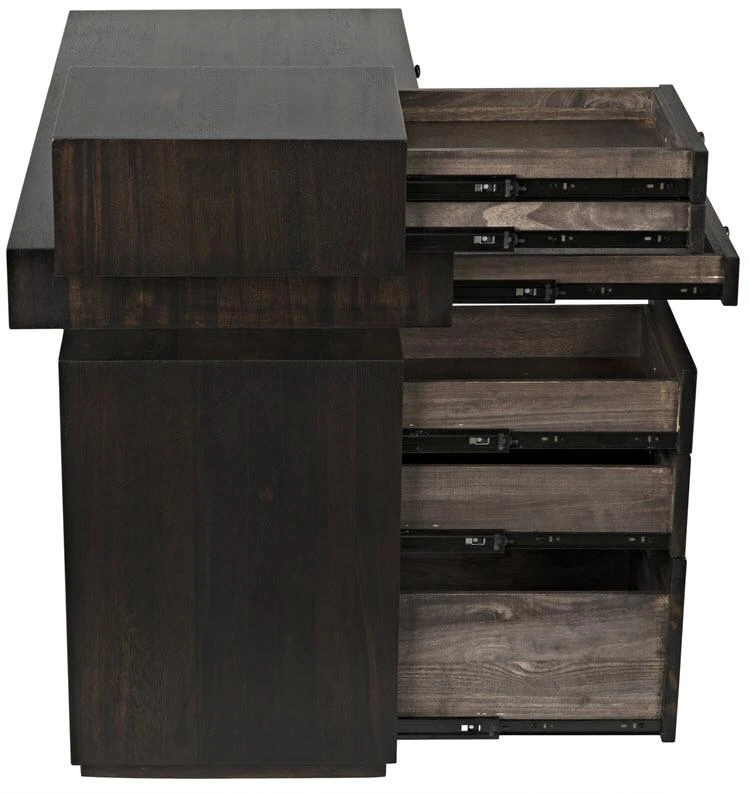 An otherwise pared down design is enhanced with the surprise of stepped drawers and an exciting asymmetrical design. Handcrafted of walnut, it is finished in rich ebony with brushed nickel pulls.