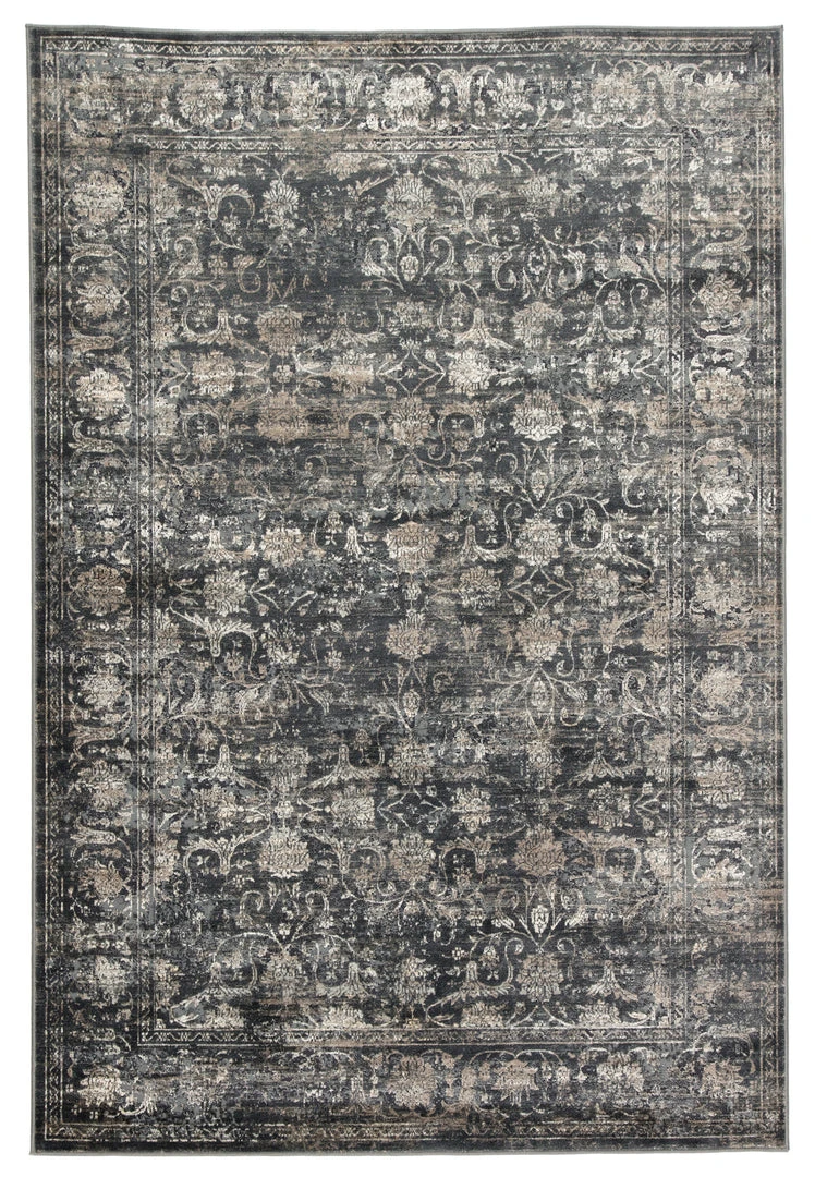 Luxurious with a glam sheen, the Caicos collection features an assortment of arresting patterns and a mixture of moody and serene hues. The Kachina rug showcases elegant Victorian influences with a subtle distressed effect over the intricate brocade design. In deep gray tones, this lustrous viscose and shrink polyester rug ls depth and dimension to transitional spaces with high-low pile.