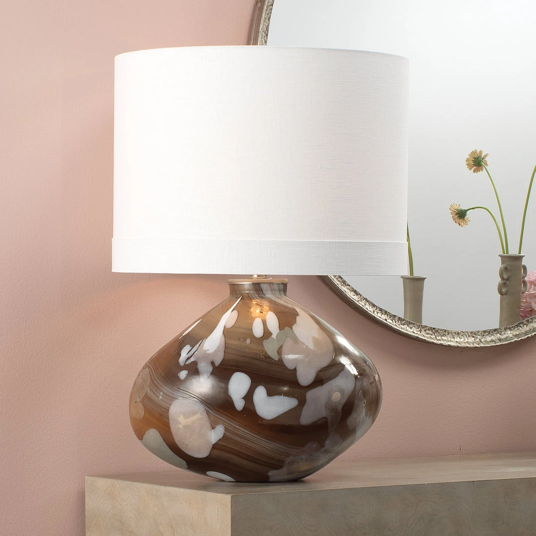 The Artist Table Lamp was designed with a hand-blown pebble shaped base with a fluid and organic silhouette. Its translucent and glossy finish makes this statement piece feel lightweight despite its scale.